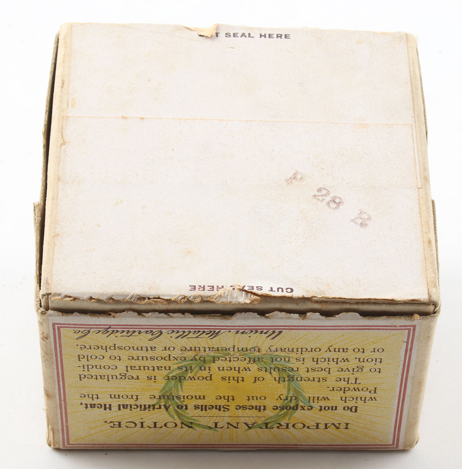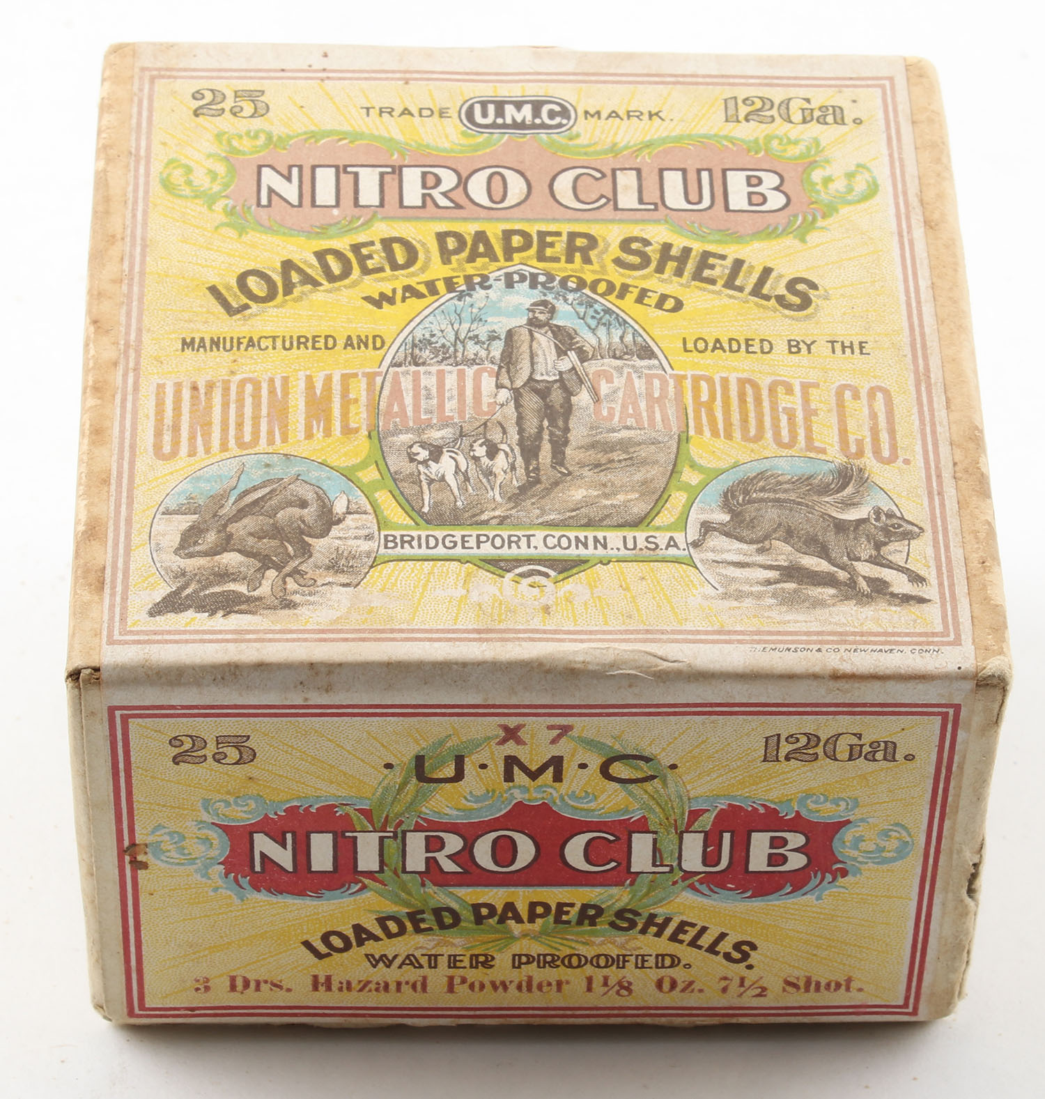 RARE!!! UMC, NITRO CLUB, WALKING MAN SERIES, 12ga., 2pc., EMPTY, shot size 7 1/2, buff box with multi colored label pictures hunter walking in center with two dogs, Rabbit in bottom left hand corner and a Squirrel in the bottom right. Box is all original and solid, wonderful colors. Box has a partial seam split, with minor age soiling, RARE & Hard to Find Box. Grade: Excellent - Value: 1500 to 3000