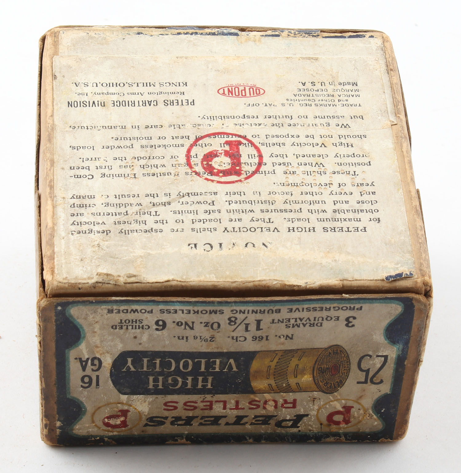 Peters Cart. Co., Blue Bill, 16ga., 2pc., Empty, shot size 6ch shot, buff box with multi colored label that pictures Blue Bill in flight, box is solid with age soiling, edge wear & scuffing. Grade: Good + - Value: 50 to 100