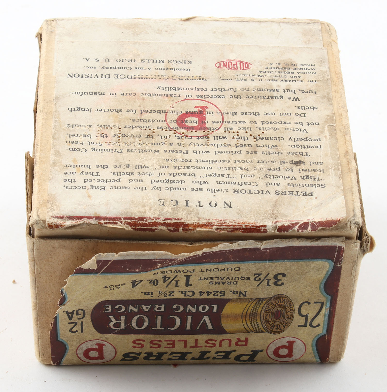 Peters Cart. Div., Victor, Rustless, 12ga., 2 3/4'', 2pc., Empty, shot size 4 CH, buff box with brown, cream & black label, box has age soiling & edge wear, has a partial tear to side label, label is 90% intact. Grade: Good ++ - Value: 20 to 40