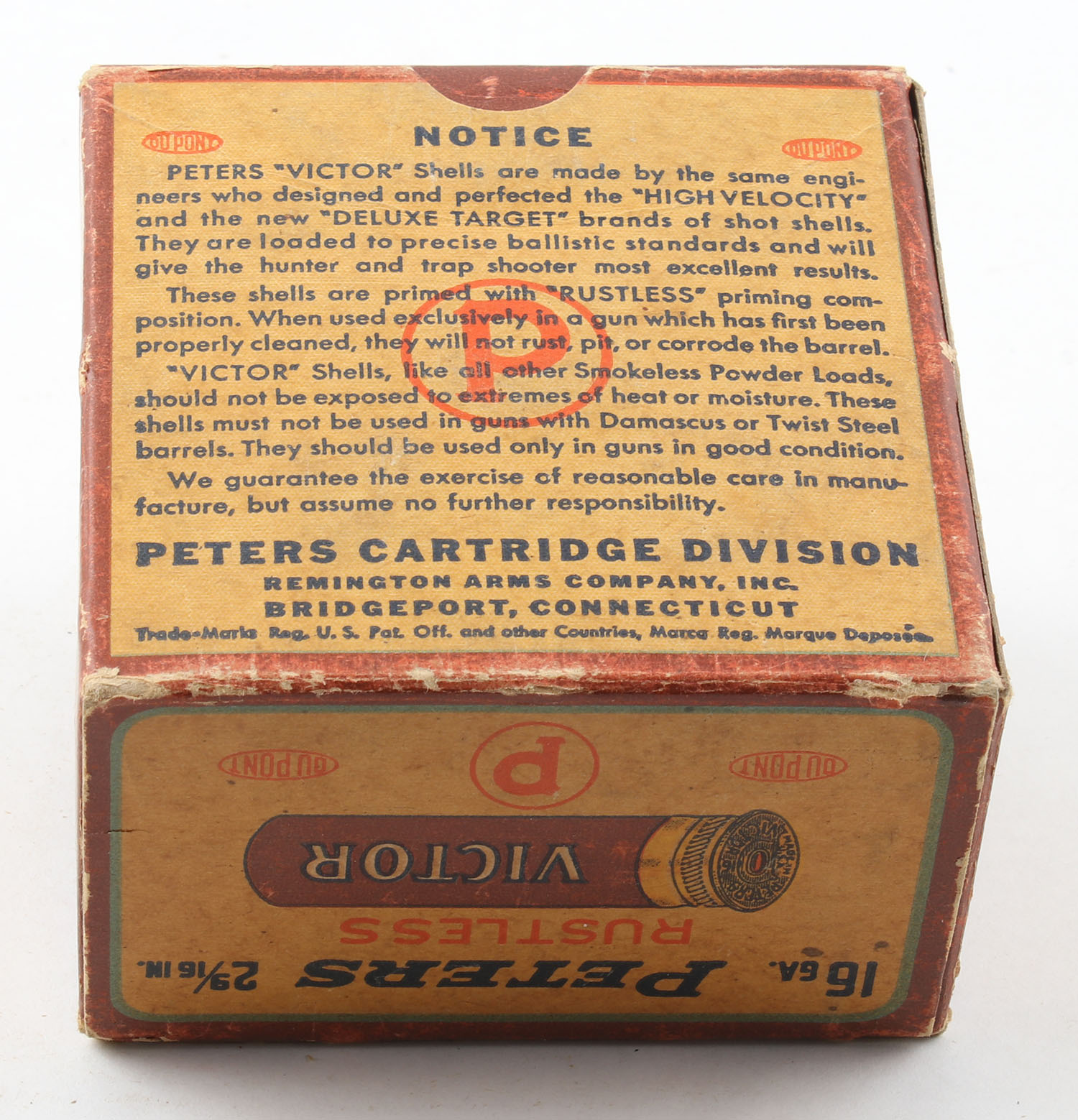 Peters, Victor, 16ga., 1pc., Full, shot size 4, 2 9/16'', Maroon, cream & orange box, box is solid with minor edge wear, box has excellent colors, paper shells are excellent. Grade: Excellent - Value: 20 to 60