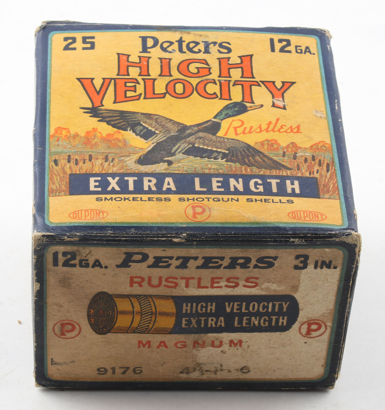 Peters Cart. Co., Bridgeport, CT, High Velocity, Extra Length 12ga., 3'' Magnum, 1pc., Partial 23rds, shot size 6, multi colored box that pictures mallard flying out of the marsh grass, box has age soiling with light scuffing, paper shells are excellent. Grade: Very Good - Value: 20 to 80
