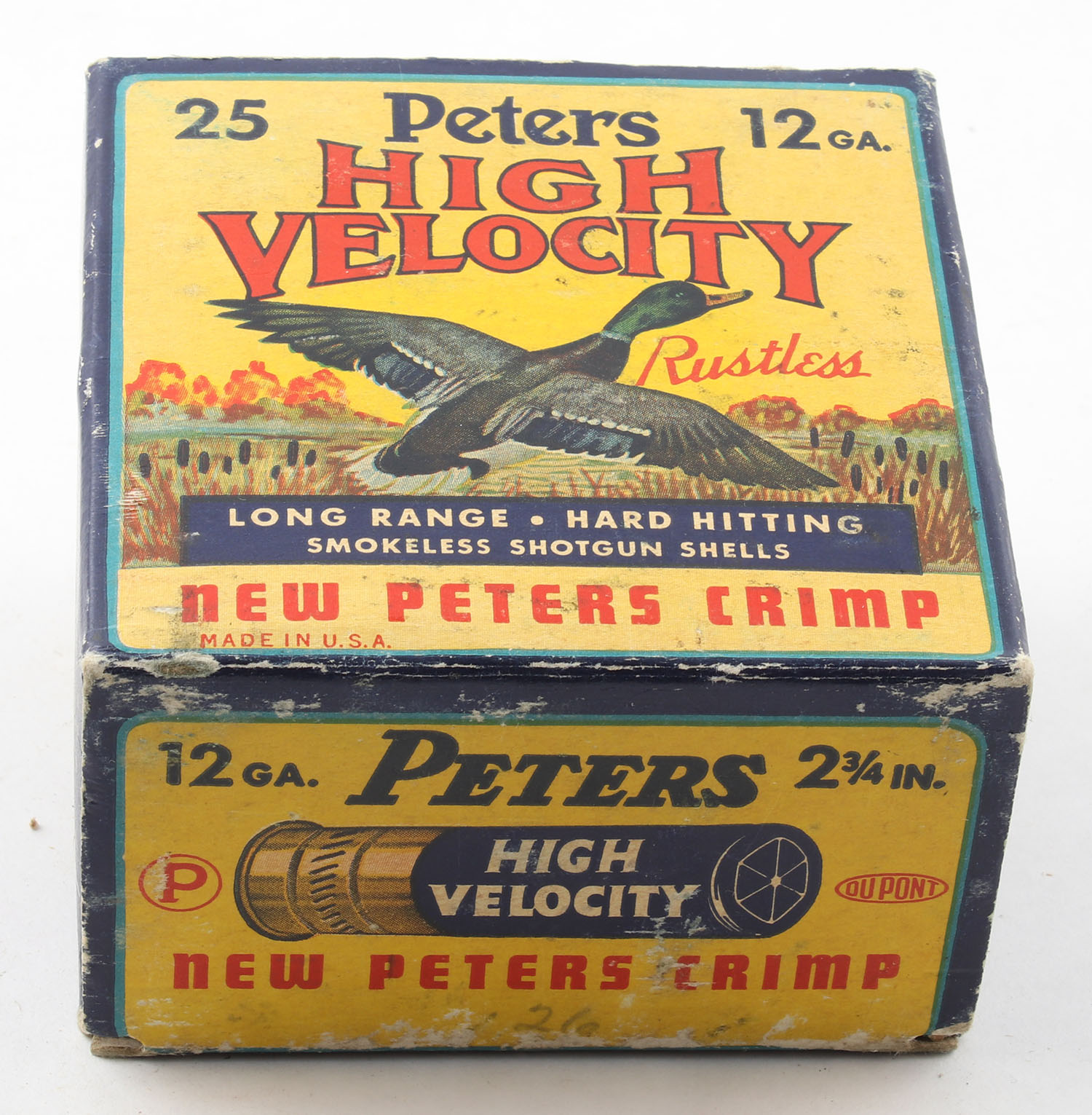 Peters Cart. Co., High Velocity, New Peters Crimp, 12ga., 1pc., Partial 24rds, shot size 6, multi colored box that pictures mallard flying out of the marsh grass, box has light scuffing with edge wear, paper shells are very good. Grade: Very Good - Value: 20 to 60