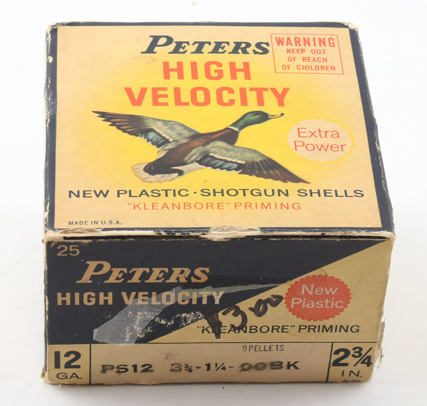 Peters Cart. Co., High Velocity, 12ga, 2 3/4'', 1pc., Full, shot size 00 Buck, multi colored box that pictures mallard flying, box is solid with light scuffing, plastic shells are excellent. Grade: Excellent - Value: 10 to 30
