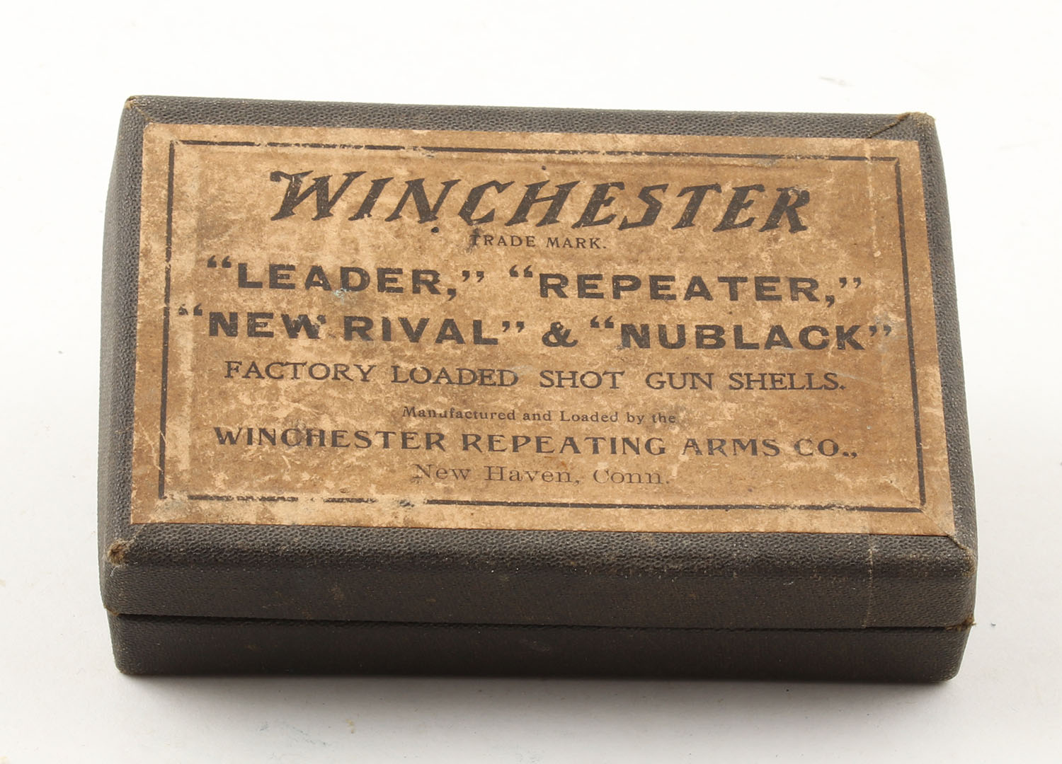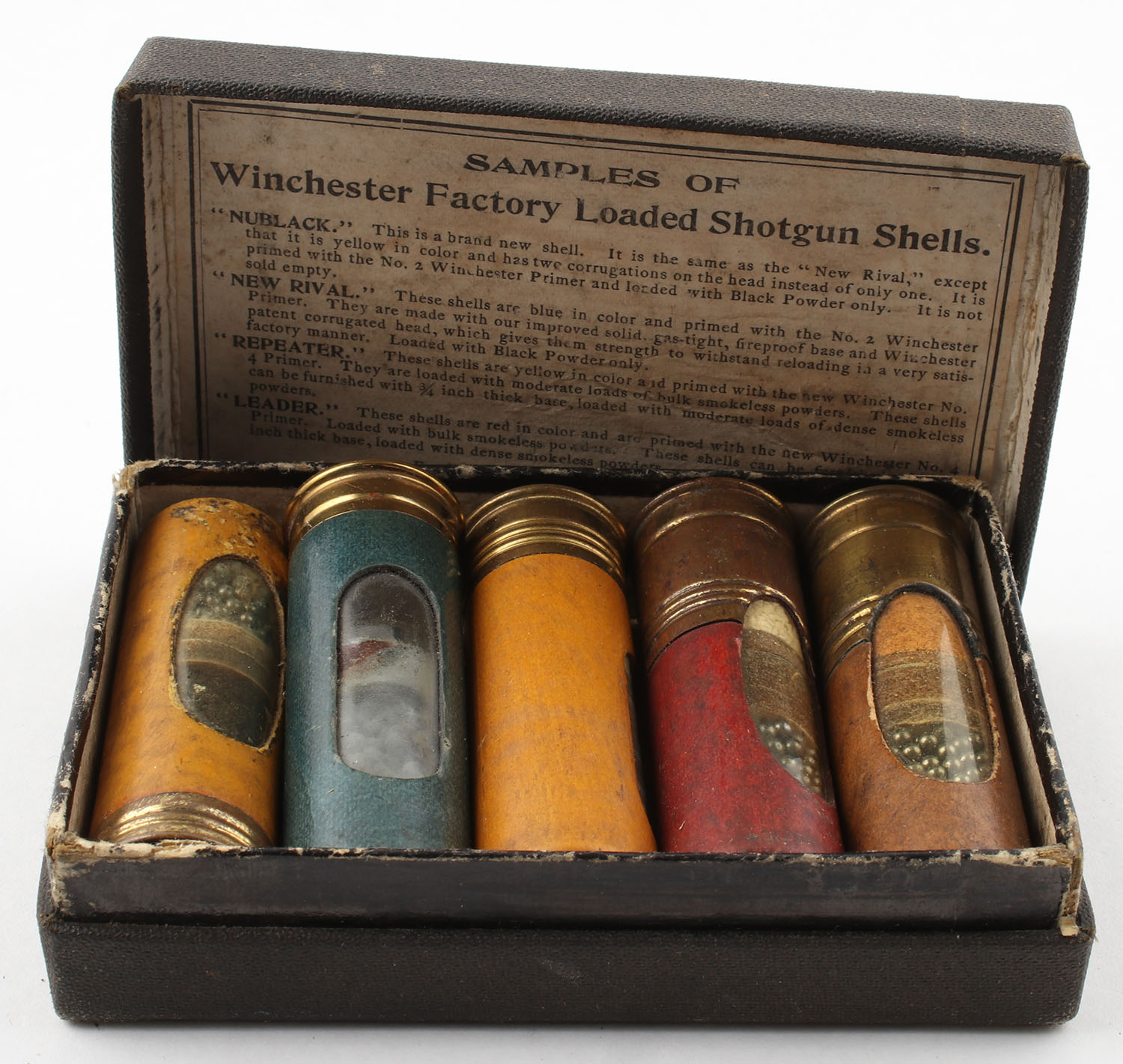 Winchester, Salesman Sample Shotshell box, 2pc., black box with buff label with black print, box is marked Leader, Repeater, New Rival, Nublack, Full and correct, box is solid with light age soiling, five window shells are very good. Grade: Excellent - Value: 300 to 600