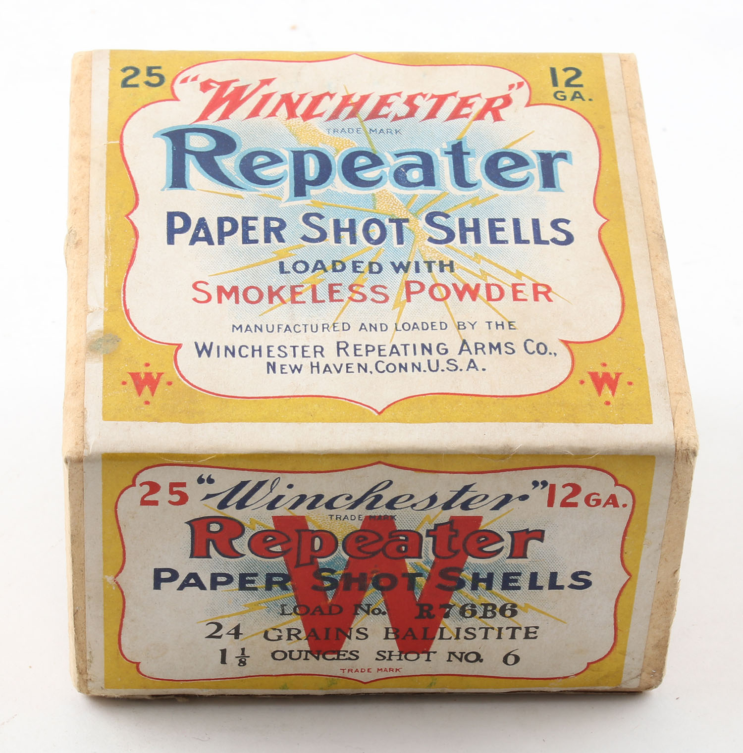 Winchester, REPEATER, 12ga., 2pc., Empty, shot size 6, buff box with yellow, white & red label showing lightning bolt, box is very solid with excellent color, has light shelf wear with light edge wear. Grade: Excellent - Value: 100 to 300