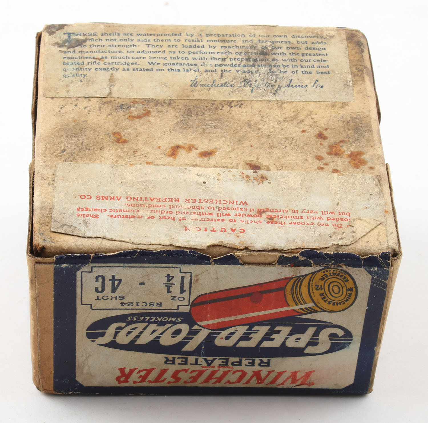 Winchester REPEATER Speed Loads, 12 Gauge, 2pc., Empty., shot size 4C, buff box with dark blue red & white paper label, Box has age soiling with scuffing & edge wear, RARE with the REPEATER markings, label is intact with great colors. Grade: Very Good - Value: 80 to 200