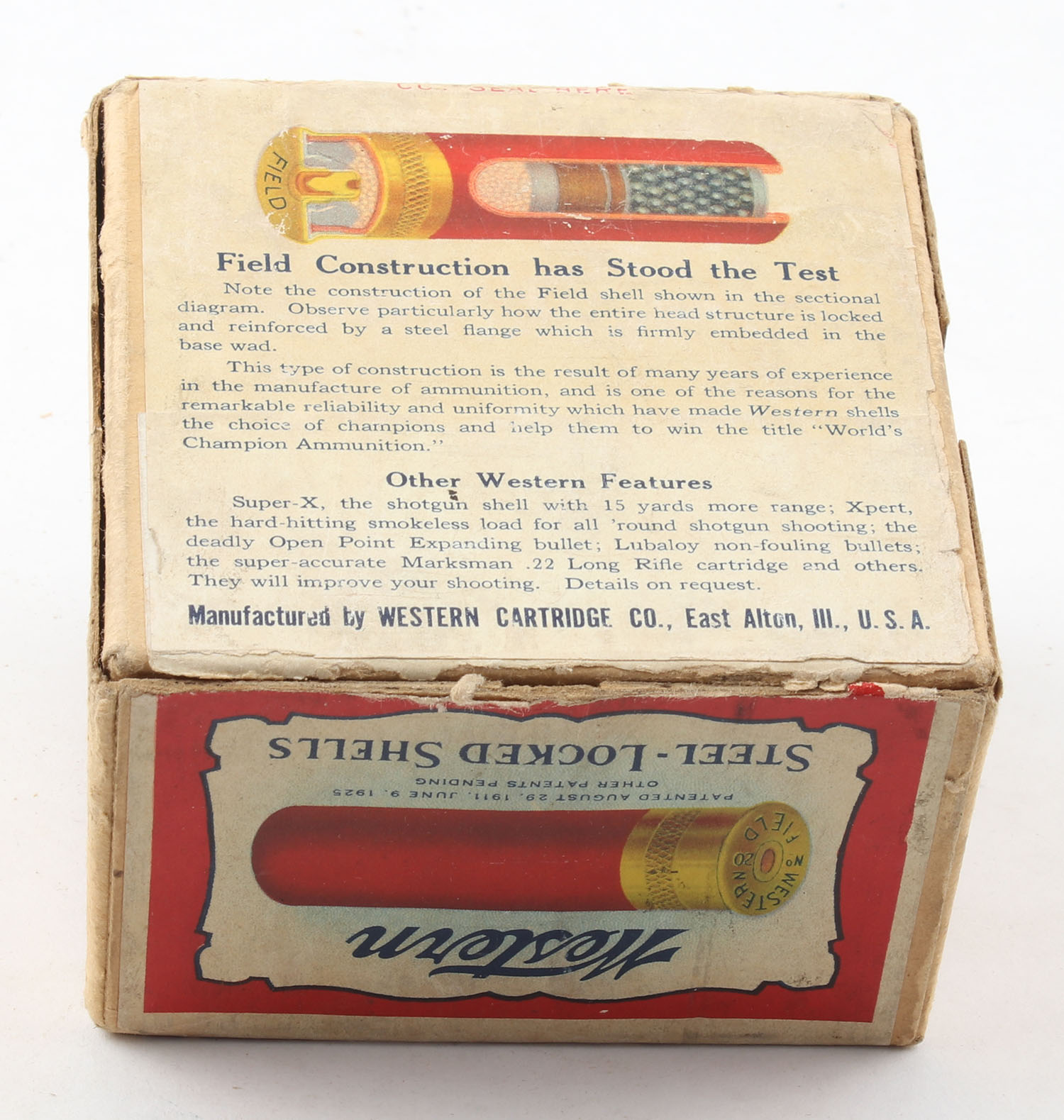 Western, Field, 20ga., 2pc., Empty, shot size 8Ch., buff box with multi-colored label, box is solid with light age soiling, label is intact with great colors. Grade: Excellent - Value: 100 to 300