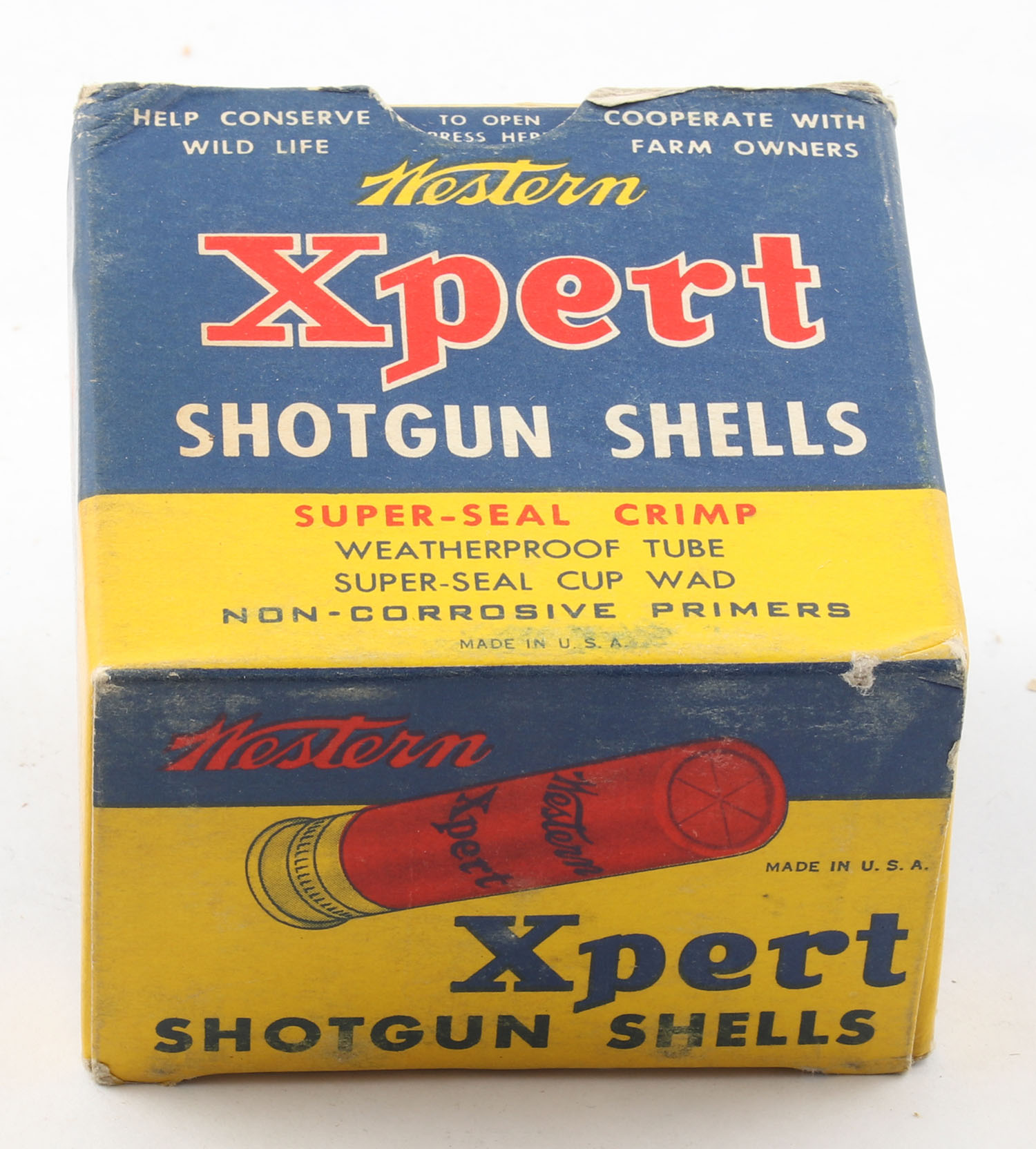 Western, Xpert, 20ga., 1pc., Full, shot size 6, 2 3/4'', multi-colored box, box is very solid with excellent color, paper shells are excellent. Grade: Excellent - Value: 10 to 30