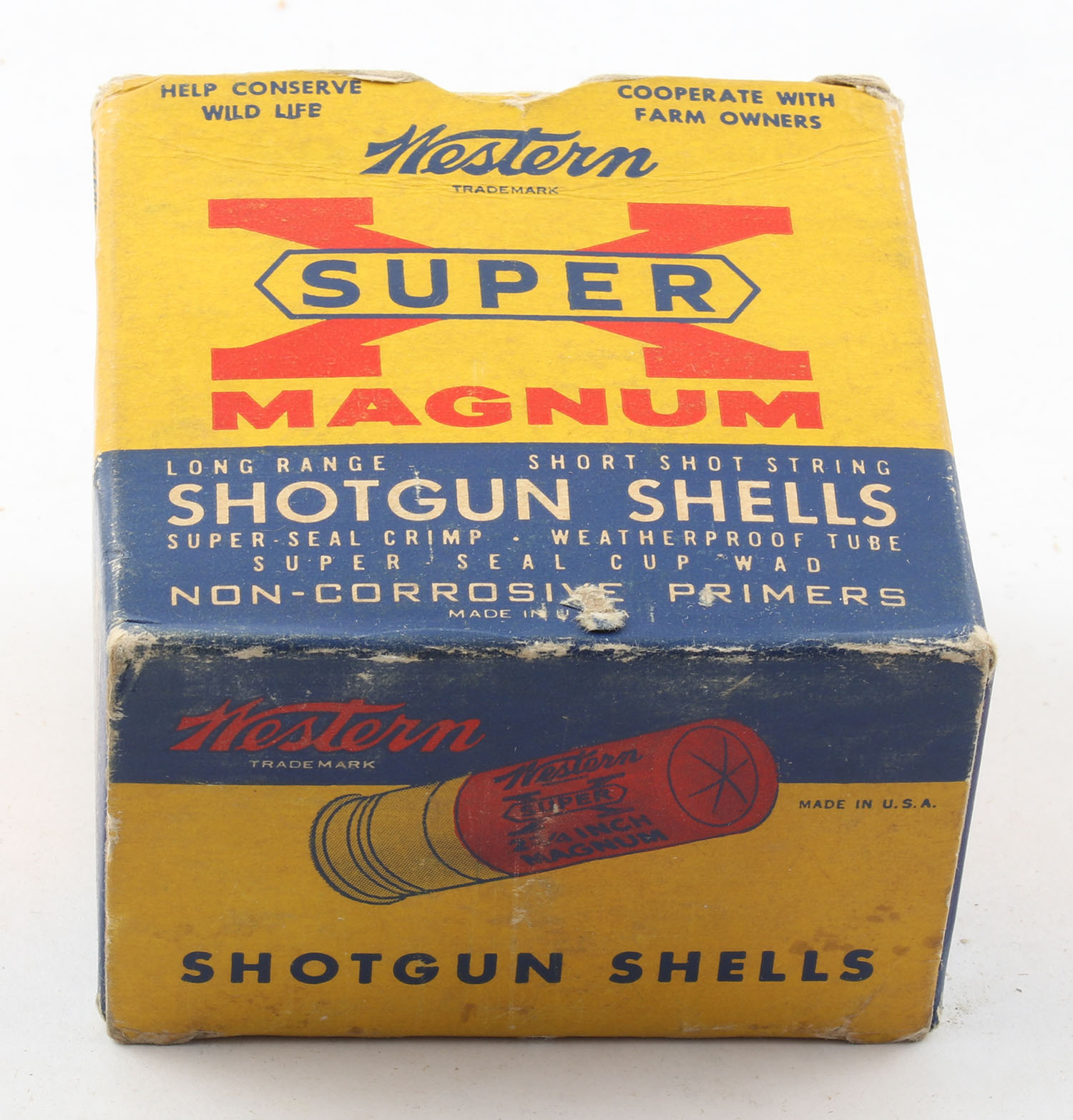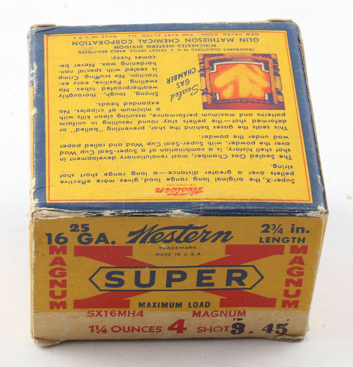Western, Super X, 16ga., 1pc., Full with 22rds being correct, shot size 4 Magnum, 2 3/4'', multi-colored box, box has scuffing with edge wear, paper shells are excellent. Grade: Very Good ++ - Value: 10 to 30