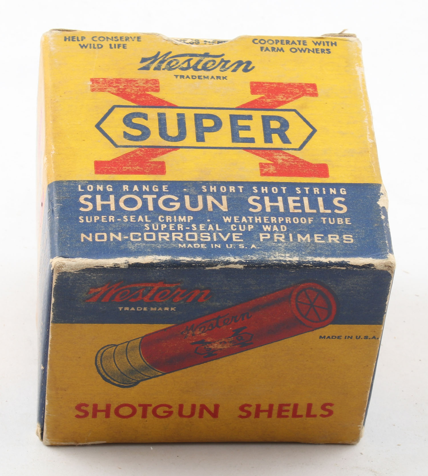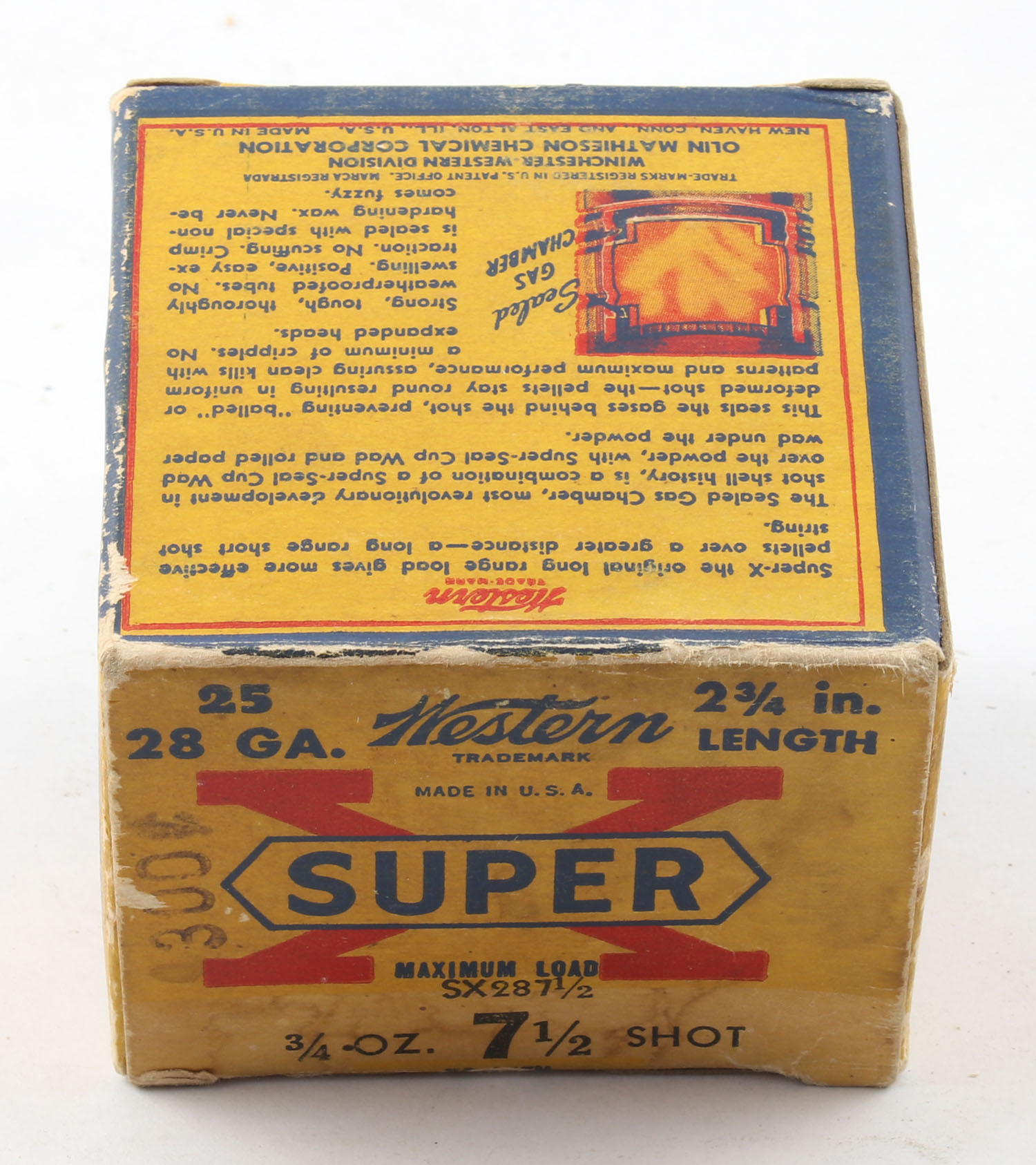 Western, Super X, 28ga., 2 3/4'', 1pc., Full, shot size 7 1/2, multi-colored box, box has edge wear with scuffing, paper shells are excellent. Grade: Very Good ++ - Value: 10 to 30