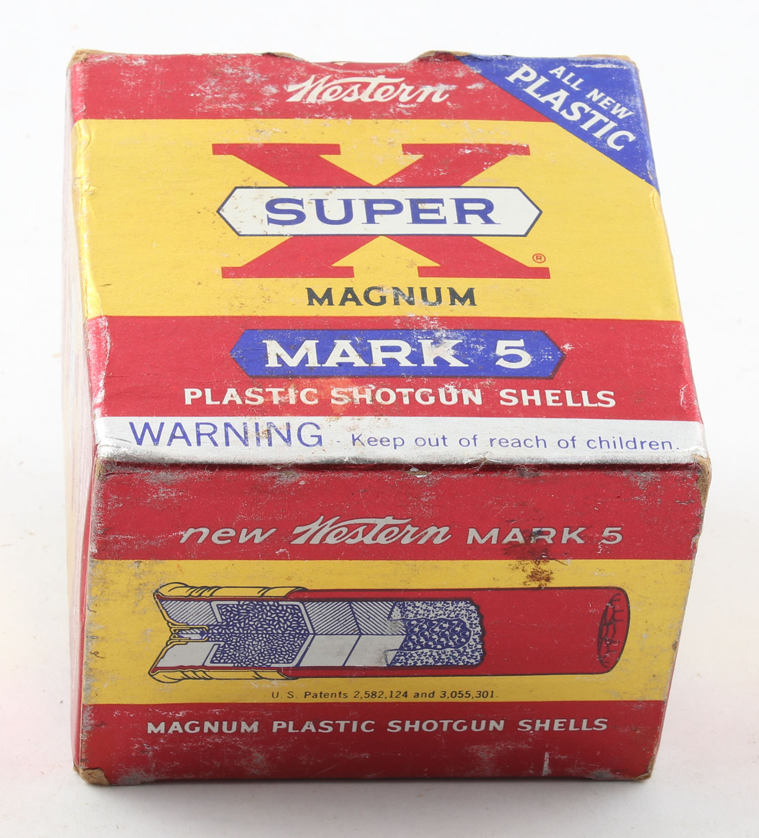 Western, Super X, Mark 5, 20ga., 3'', 1pc., Full, shot size 6 Magnum, multi-colored box, box has scuffing & light edge wear, box has very nice colors, plastic shells are excellent. Grade: Very Good ++ - Value: 10 to 30