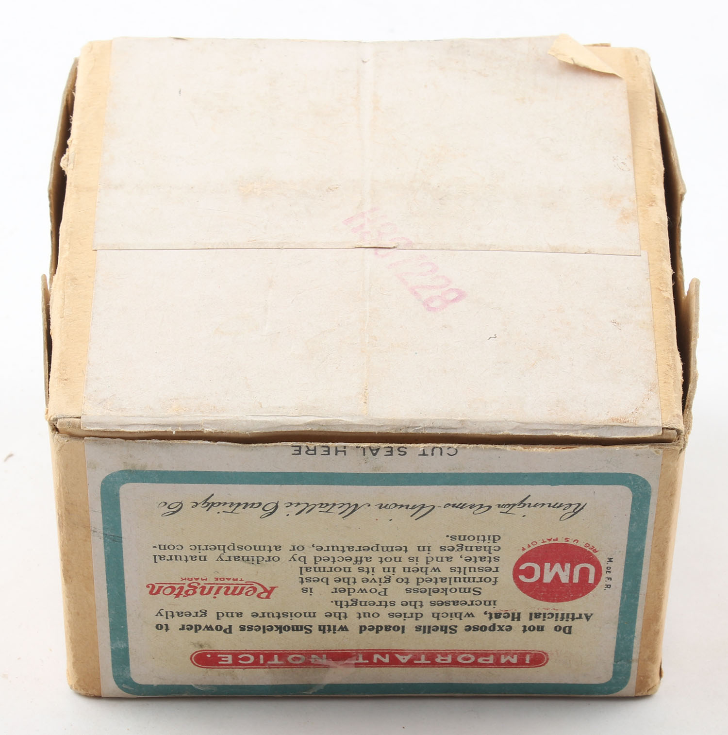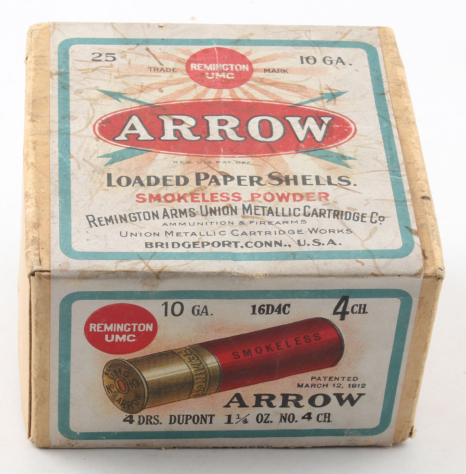 Remington UMC, Arrow, 10ga., 2pc., Partial 17rds with 15rds being correct, shot size 4CH., 4 Drs., 1 1/4 Oz., buff box with sunburst logo, has overstamp ''Steel Lined'', box has light age soiling with rub marks, paper shells are excellent. Grade: Excellent - Value: 60 to 200