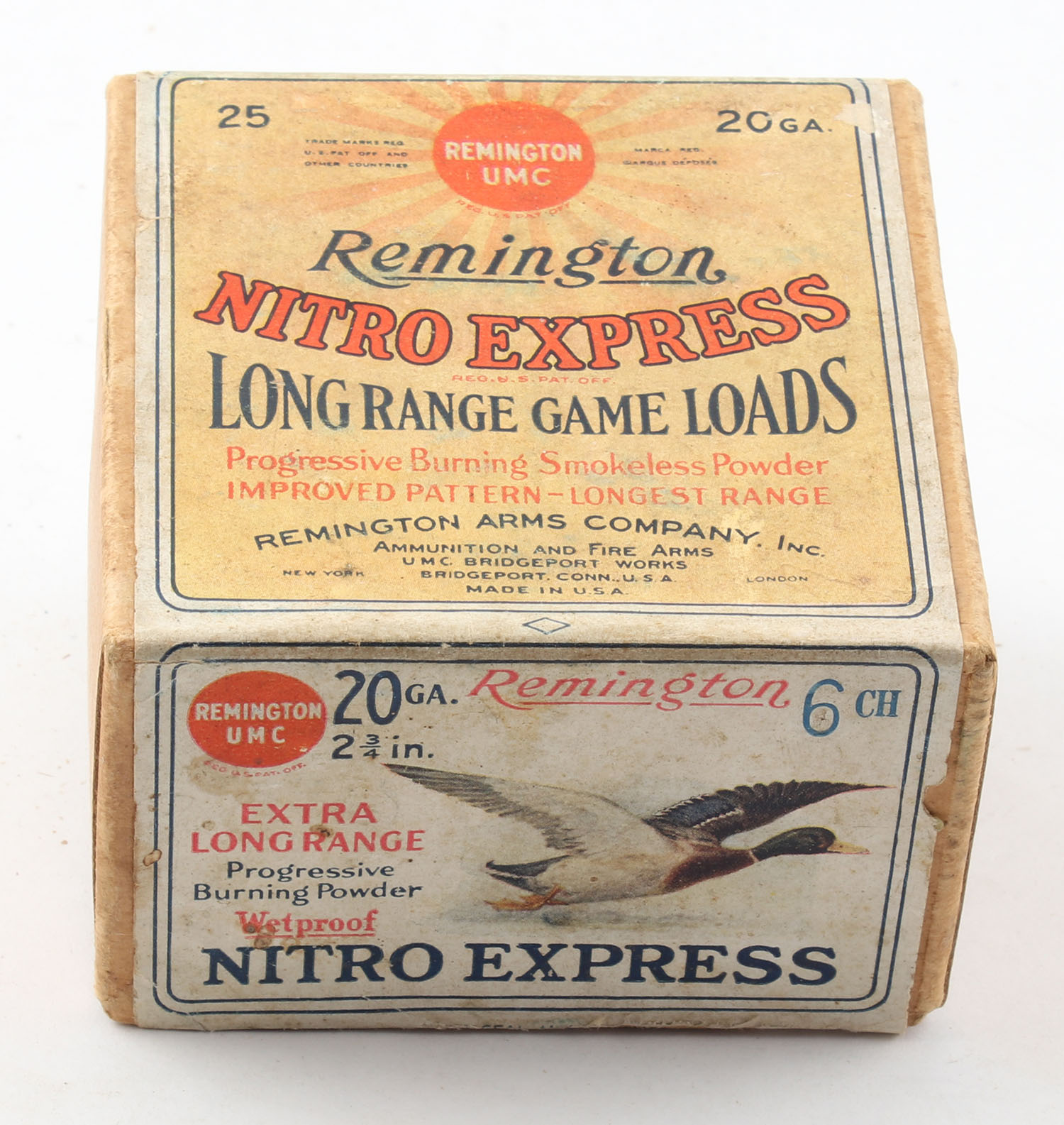 Remington Nitro Express Long Range GAME LOADS, Flying Mallard, 20ga., 2pc., Empty, shot size 6 CH, buff box with sunburst logo, box has light age soiling & light edge wear, label is intact. Grade: Very Good ++ - Value: 20 to 80