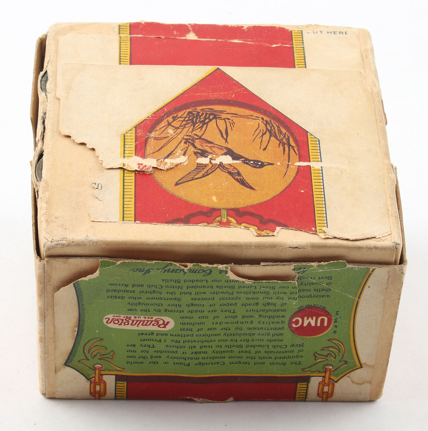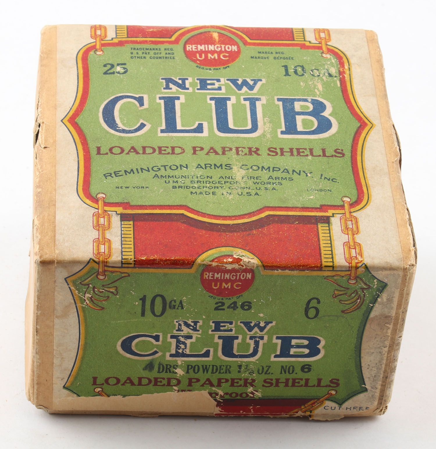 Remington UMC, New Club, 10ga., 2pc., Partial 23rds., Loading: 4 Drs., 1 1/8 Oz., Shot size 6, buff box with green, yellow, blue & red paper label, box has light age soiling with edge wear, label is 90% intact with great color, paper shells are excellent. Grade: Very Good - Value: 80 to 200