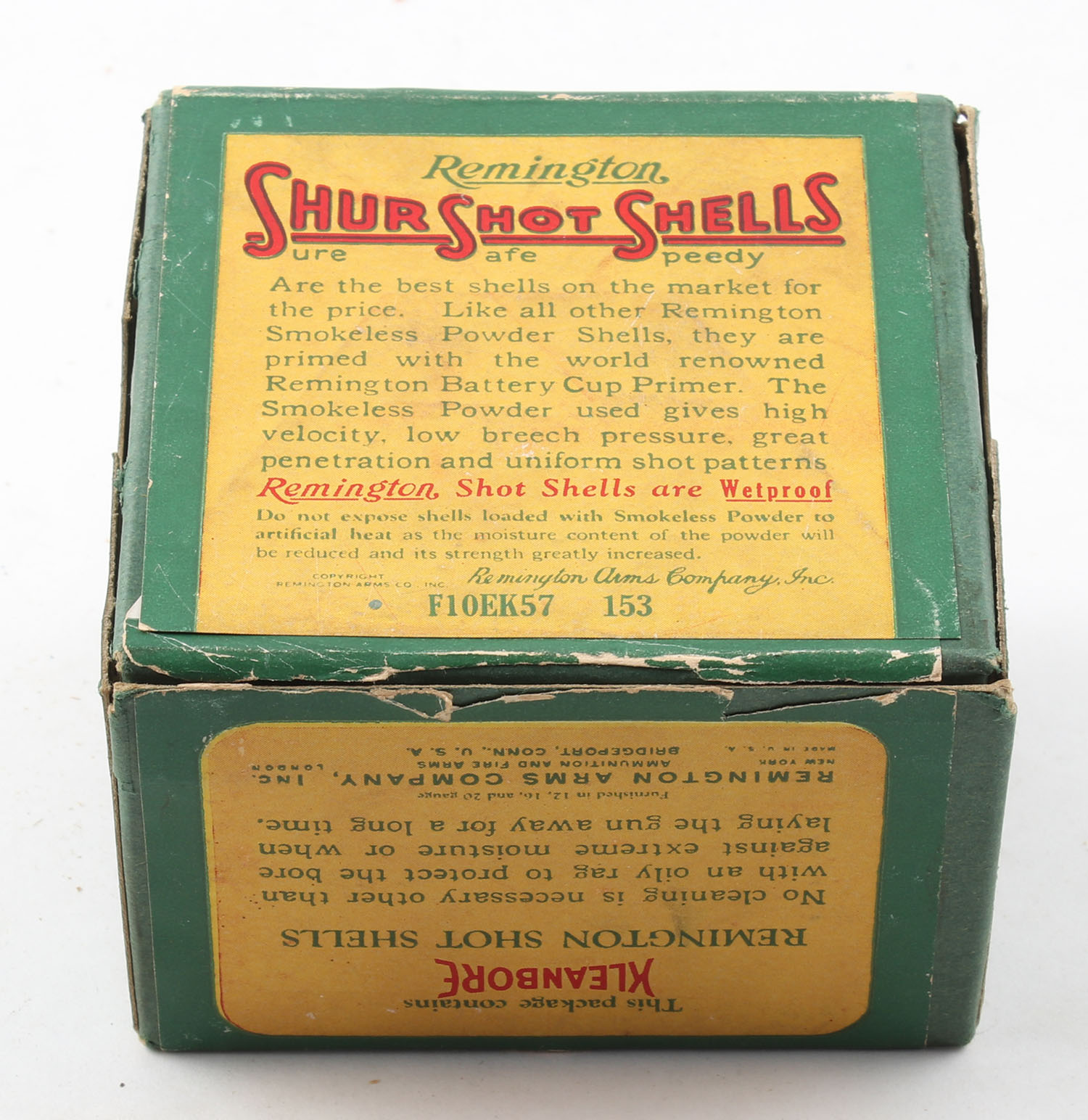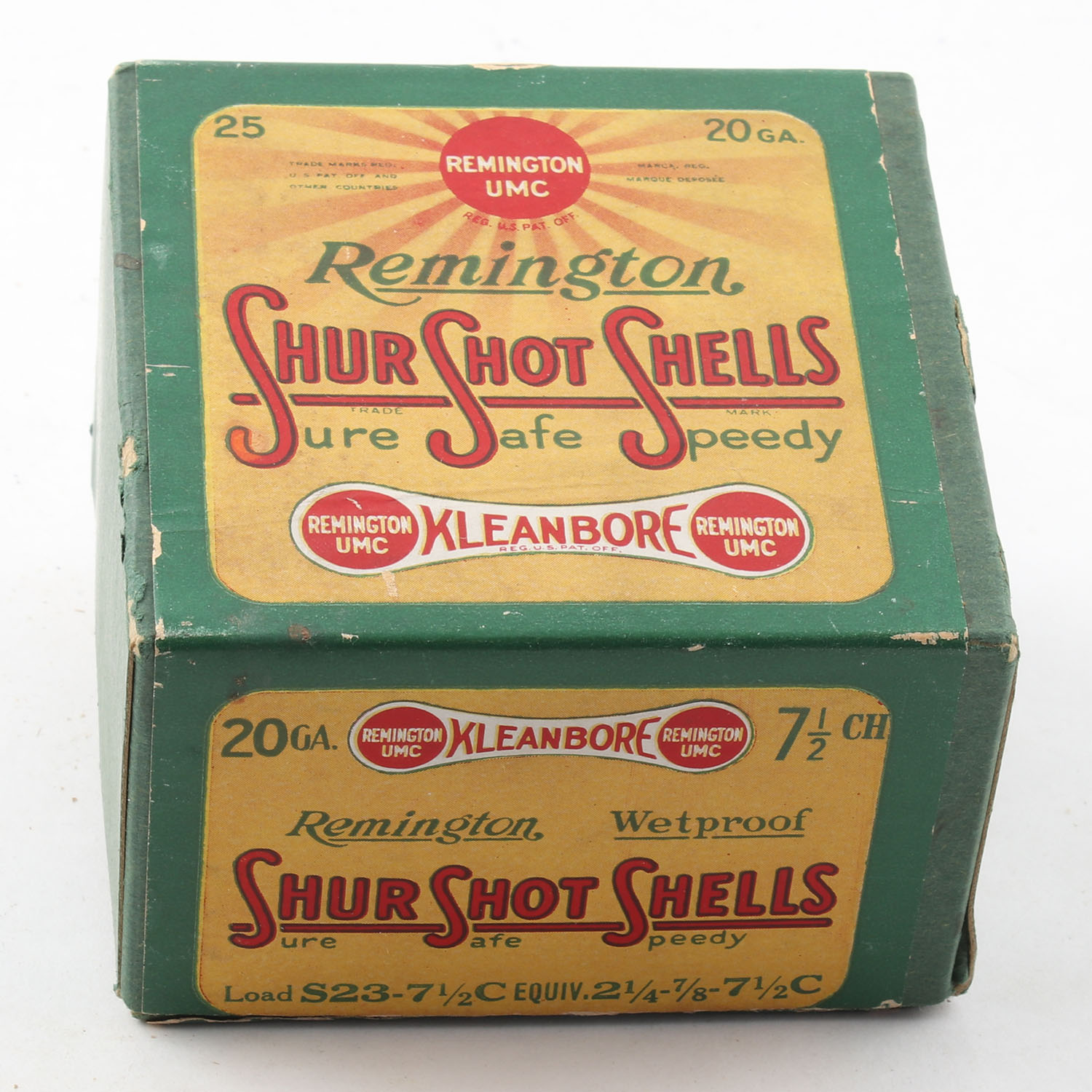 Remington UMC, Shur Shot Shells, 20ga., 2pc., Empty, shot size 7 1/2CH, green box with green, yellow & red paper label, box has minor scuffing with edge wear, box is solid with great colors. Grade: Very Good ++ - Value: 20 to 60