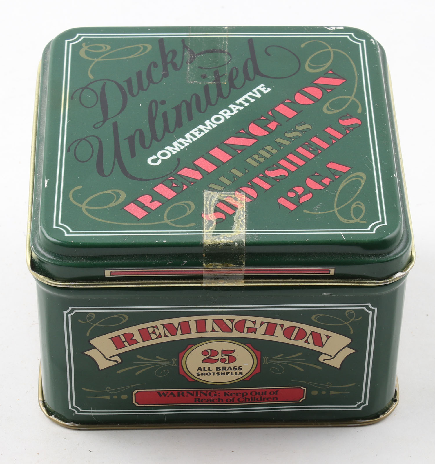 Duck Unlimited Commemorative Remington All Brass Shotshells 12ga., Full, Factory Insert, metal tin has very good graphics, brass shells are MINTY. Grade: Excellent + - Value: 30 to 100