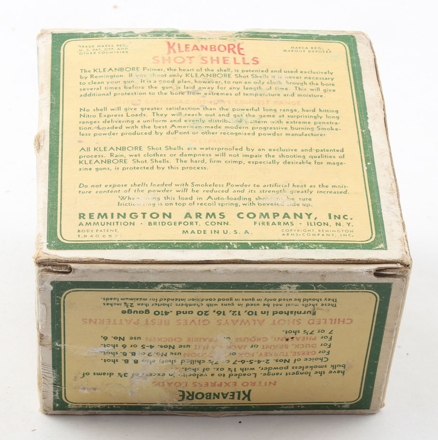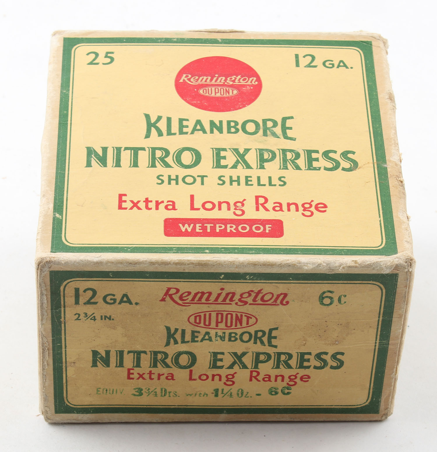 Remington, Kleanbore, NITRO EXPRESS, 12ga., 2 3/4'', 1pc., Full, shot size 6 C, box is buff, yellow, red and green, box has edge wear with great colors, paper shells are excellent. Grade: Very Good ++ - Value: 20 to 60