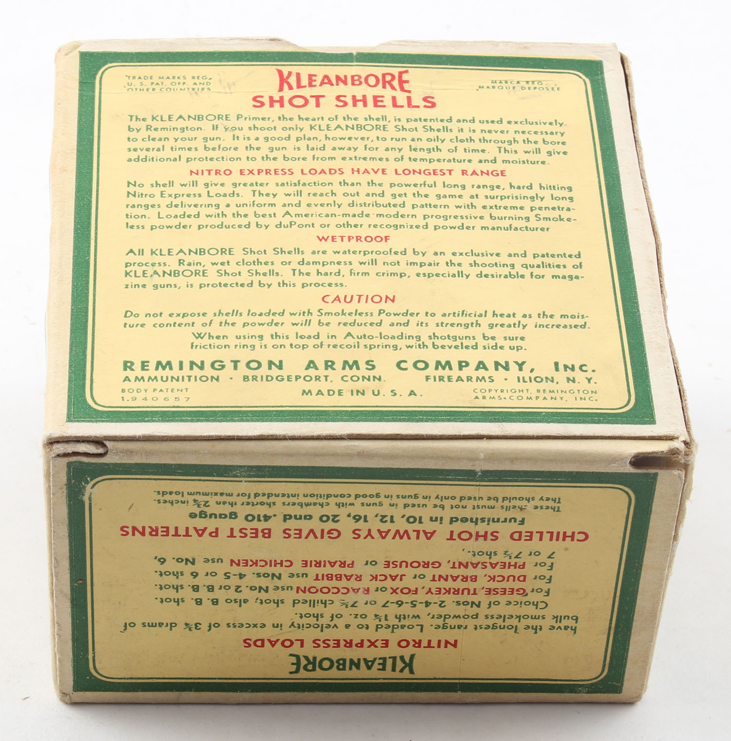 Remington, Kleanbore, NITRO EXPRESS, 12ga., 2 3/4'', 1pc., Full, shot size 6 C, box is buff, yellow, red and green, box has edge wear & scuffing with great colors, paper shells are excellent. Grade: Very Good ++ - Value: 20 to 60