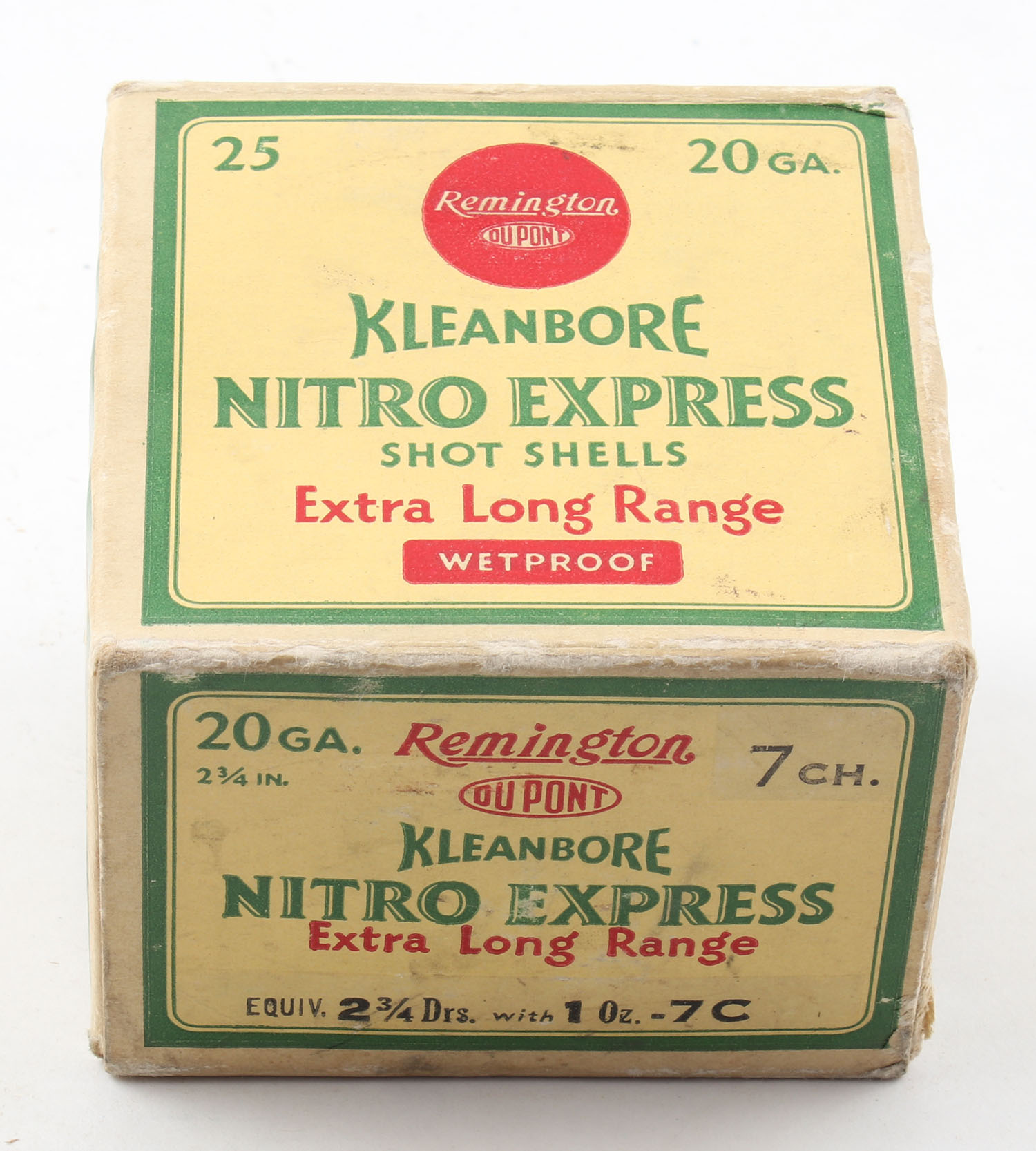 Remington, Kleanbore, NITRO EXPRESS, 20ga., 1pc., Full, shot size 7Ch., box is yellow, red and green, box is solid with edge wear & nice colors, paper shells are excellent. Grade: Very Good ++ - Value: 20 to 60