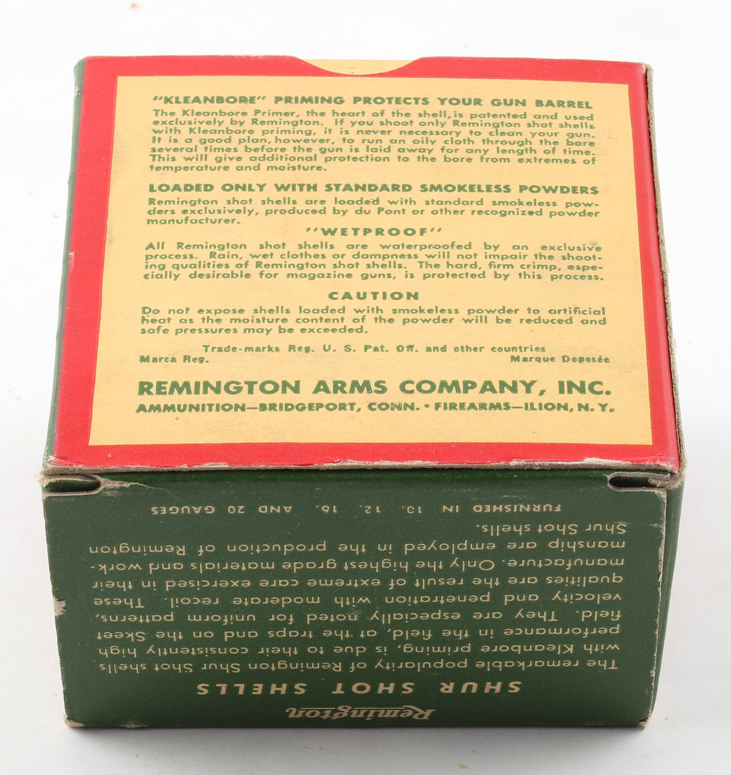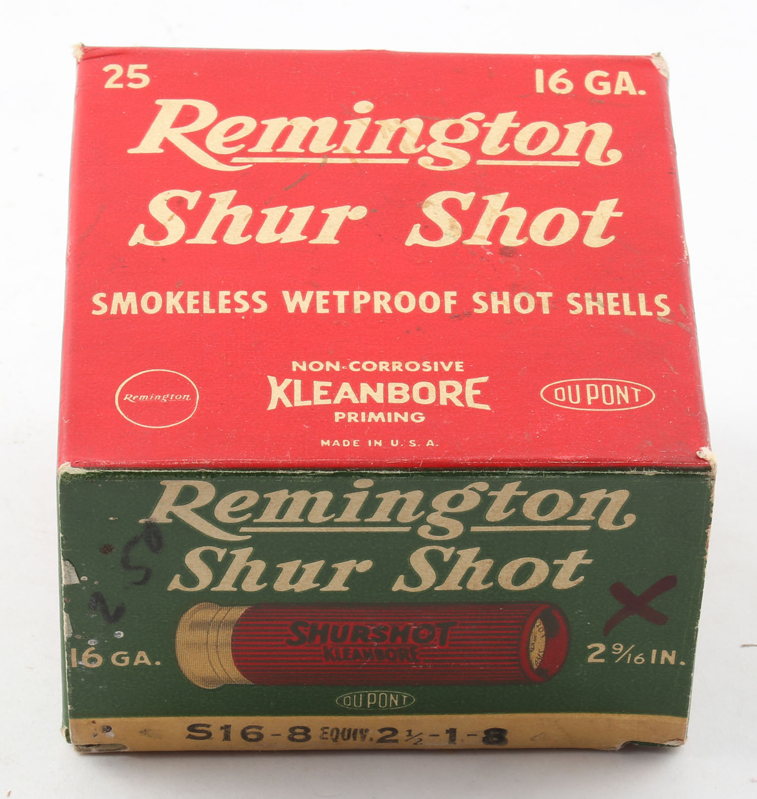 Remington Shur Shot, 16ga., 2 9/16'', 1pc., Full, shot size 8, box is white, yellow, red and green, box is very solid with excellent color, paper shells are minty. Grade: Excellent ++ - Value: 10 to 40