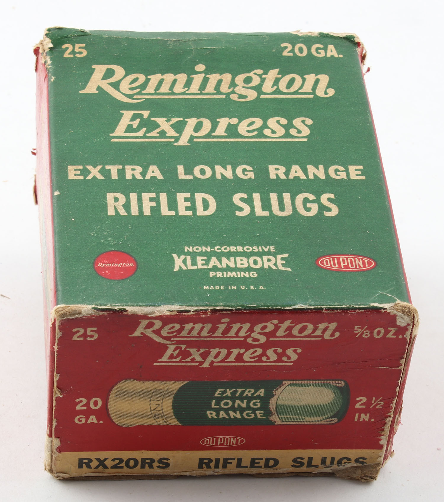 Remington, Express Extra Long Range, 20ga., 1pc., Full, shot size Rifled Slugs, 2 1/2'', case has five boxes inside each has 5rds., inside boxes are excellent. Case has edge & corner wear, shells are excellent. Grade: Very Good ++ - Value: 10 to 30