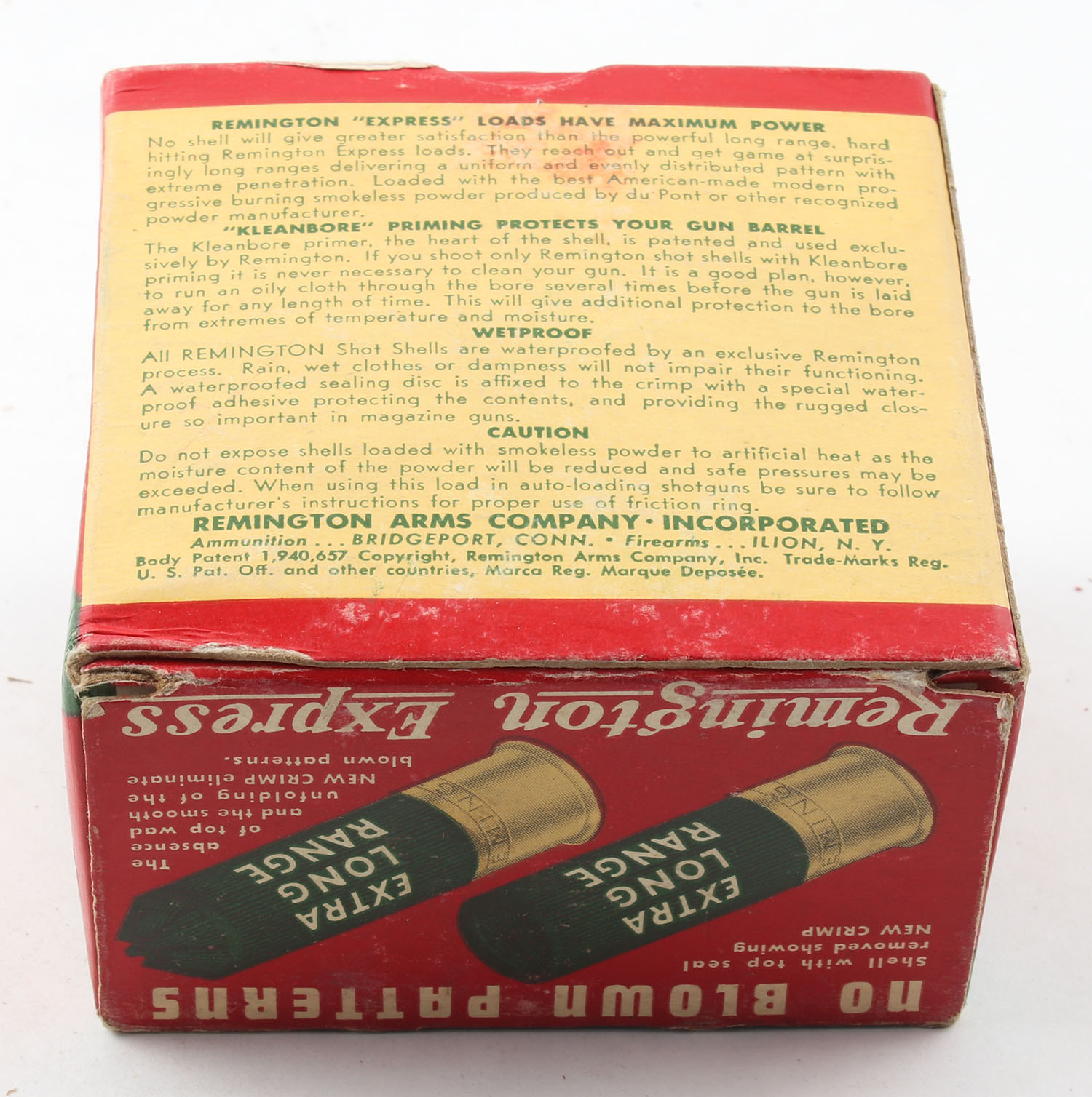 Remington Express, Extra Long Range, 12ga., 2 3/4'', 1pc., Partial 23rds with 22rds. being correct, shot size 4, box is red, white and green, box has light shelf wear with great colors, paper shells are very good. Grade: Very Good - Value: 10 to 30