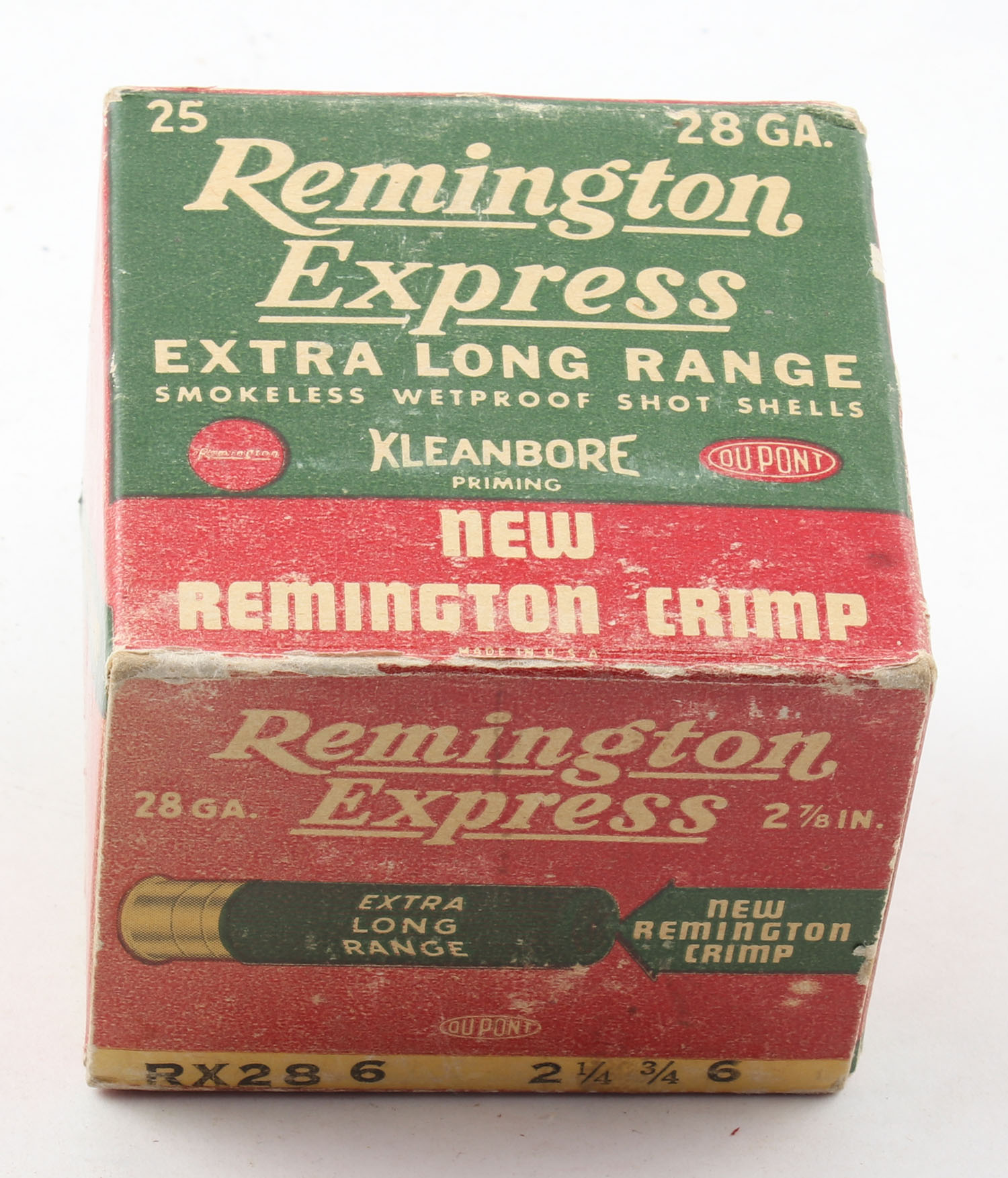 Remington Express, Extra Long Range, 28ga., 2 7/8'', 1pc., Full, shot size 6, box is white, yellow, red and green, box has age soiling & edge wear, paper shells are very good. Grade: Very Good + - Value: 10 to 40
