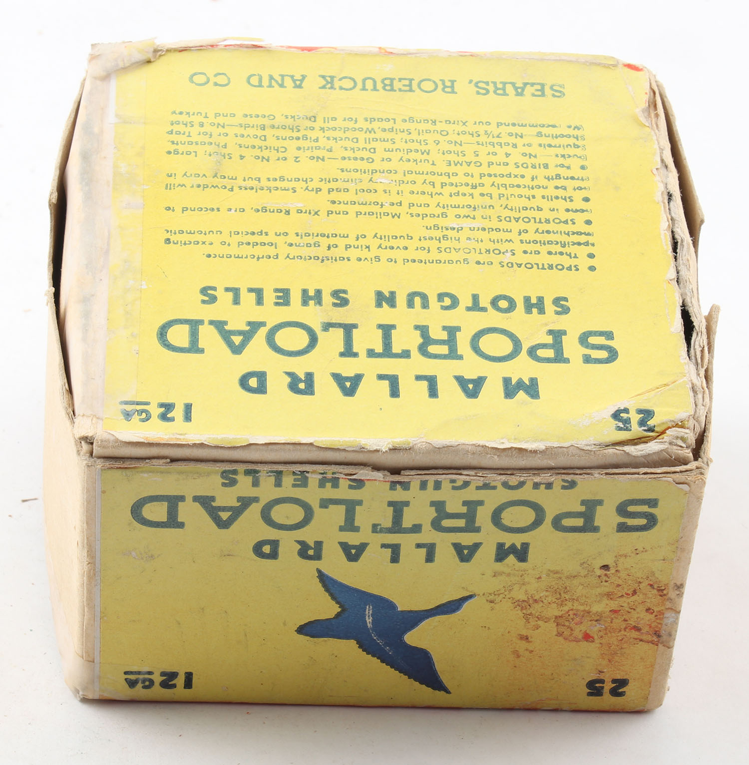 Sears, Sportload MALLARD, 12ga., 2pc., Full, shot size 6CH., red & blue box that pictures a Mallard in flight, box has two seam splits with tape repairs, has scuffing to bottom & edge wear, 50% of label is faded to yellow, paper shells are excellent. Grade: Good - Value: 20 to 100