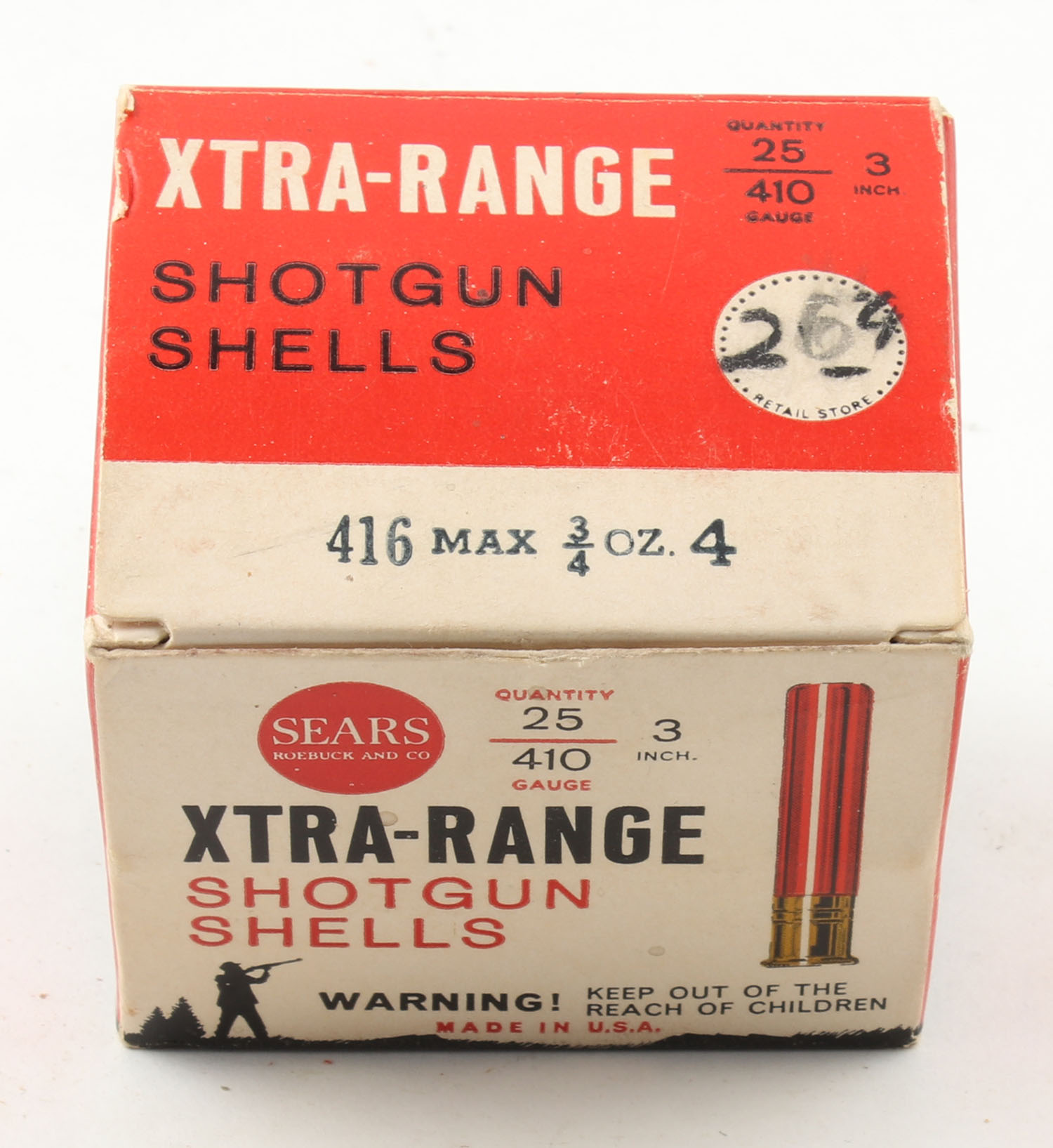 Sears, Xtra-Range, 410ga., 1pc., Full, Shot Size 4, 3'', box is solid with nice colors, paper shells are excellent. Grade: Excellent - Value: 10 to 40