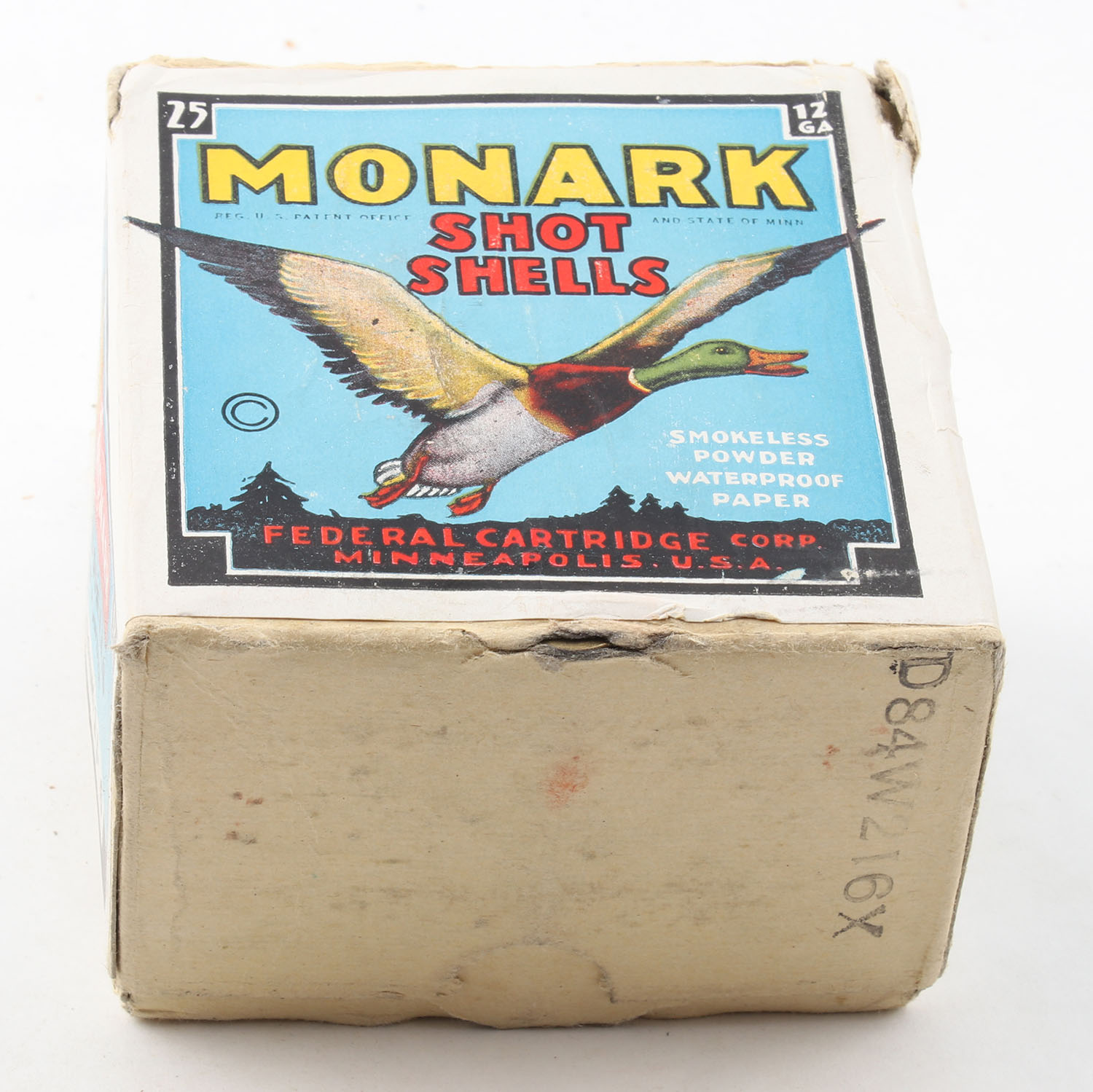 Federal Cart. Co., MONARK, 12ga., 2 PIECE!, FULL & SEALED, shot size 6, buff box with black border & multi-colored label that pictures Mallard in flight, box has a seam split to top & bottom, has edge wear, box has excellent color. Grade: Very Good ++ - Value: 100 to 300