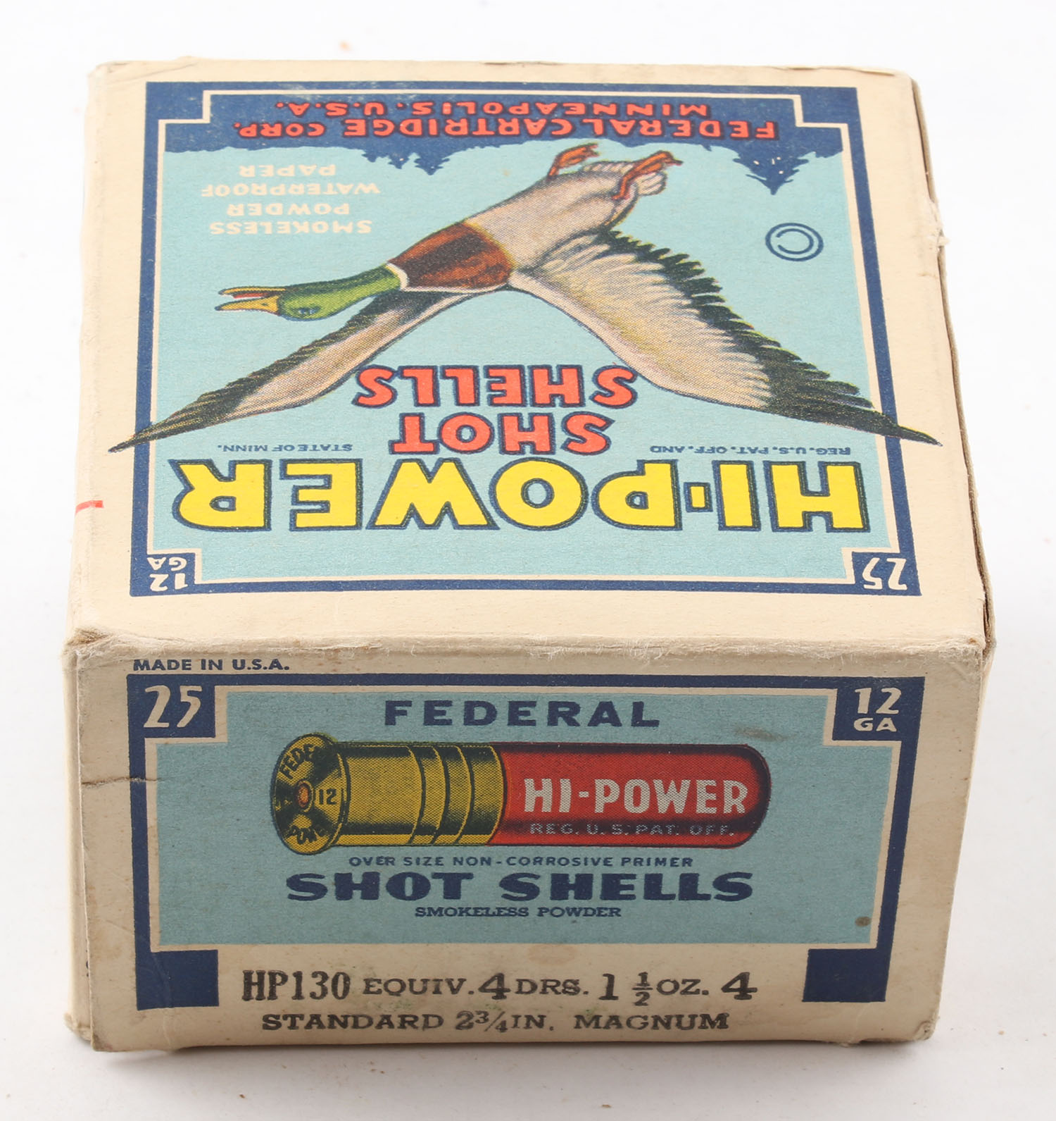 Federal Cart. Co., HI-POWER, 12ga., 1pc., Partial 24rds., shot size 4 Magnum, Blue border, blue, yellow and red box with flying mallard, box has age soiling with great colors, paper shells are excellent. Grade: Very Good ++ - Value: 10 to 40