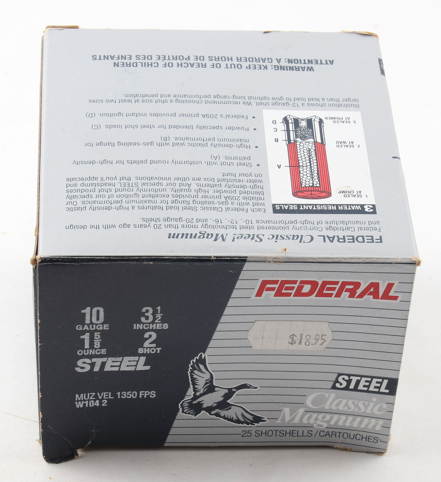 Federal, Steel Magnum, 10ga., 1pc., Partial 20rds, shot size 2, 3 1/2'', multi-colored box, box is solid, plastic shells are excellent. Grade: Excellent - Value: 20 to 40