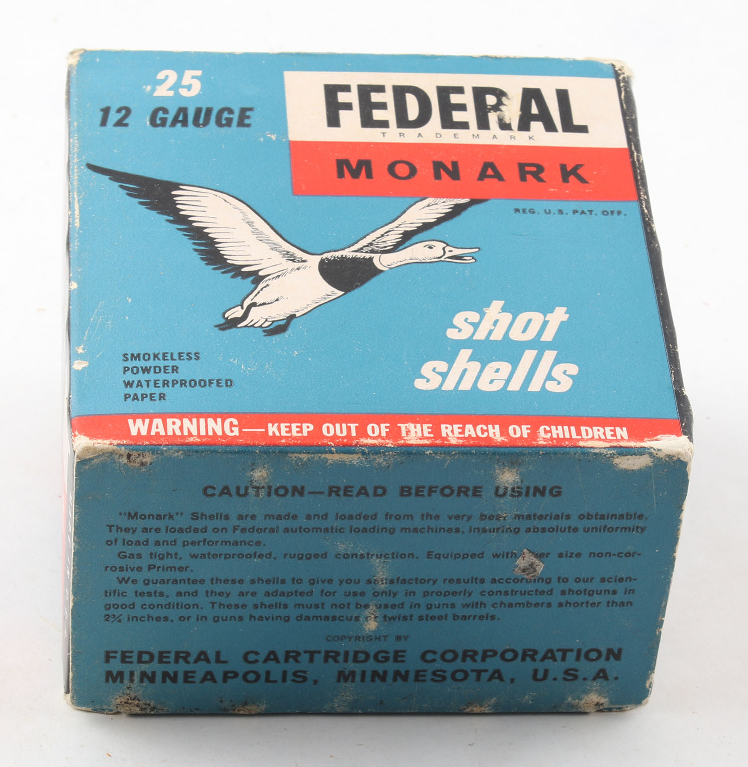 Federal, Monark, 12ga., 1pc., Full, shot size 7 1/2, multi-colored box, box has scuffing & edge wear, paper shells are excellent. Grade: Vey Good ++ - Value: 10 to 30