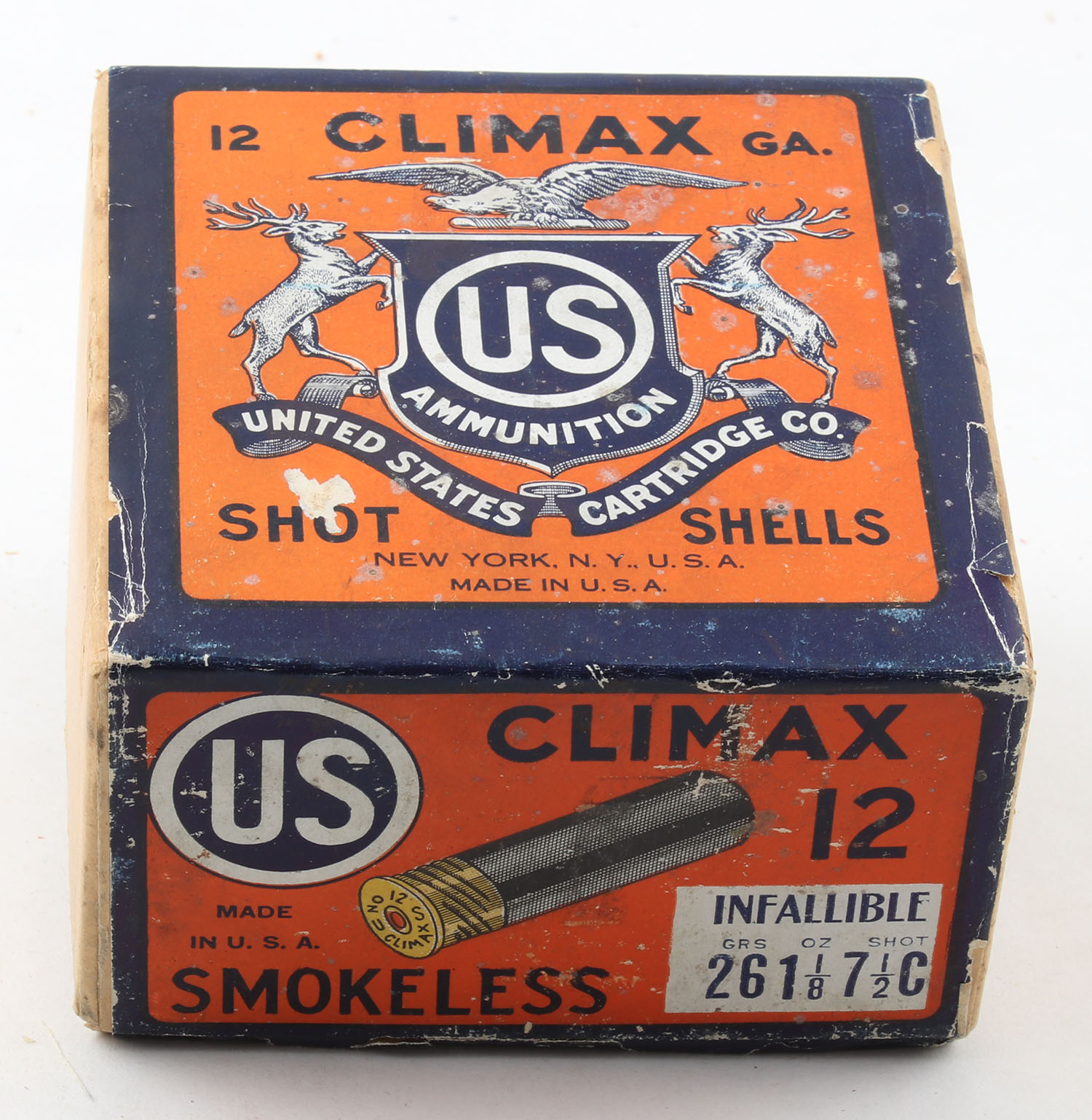 US Cart. Co., New York, NY, Climax, Smokeless 12ga, 2pc., FULL & SEALED, shot size 7 1/2CH, buff box orange, blue & white label, box is very solid with great colors, has scuffing with light edge wear. Grade: Excellent ++ - Value: 100 to 500