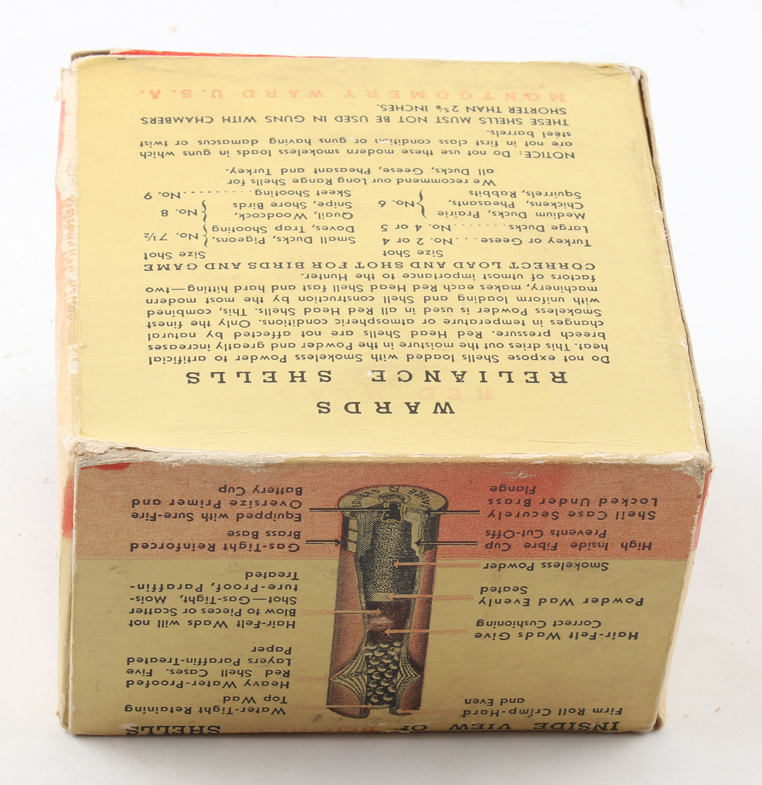 Montgomery Ward & Co., Red Head Reliance, 12ga., 1pc., Full, shot size 4, red background with black goose flying through the moon, box has light age soiling & scuffing, has edge & corner wear with a partial tear to bottom flap, paper shells are excellent. Grade: Very Good - Value: 20 to 80