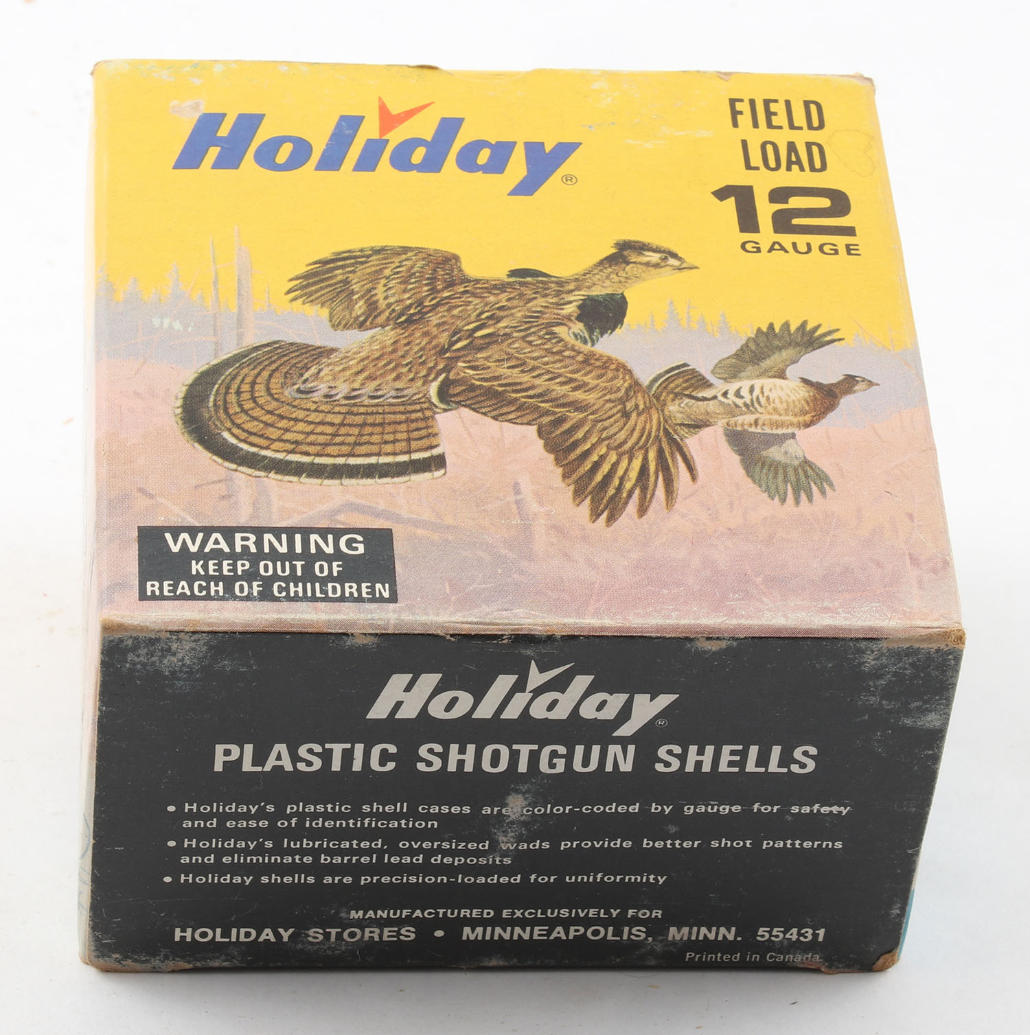 Holiday, Grouse/Rabbit Scene, 12ga., 1pc., Full, 2 3/4'', shot size 8, multi color graphics of Grouse/Rabbit by Les Kouba, box is solid with excellent colors, box has light scuffing, plastic shells are excellent. Grade: Excellent - Value: 40 to 80
