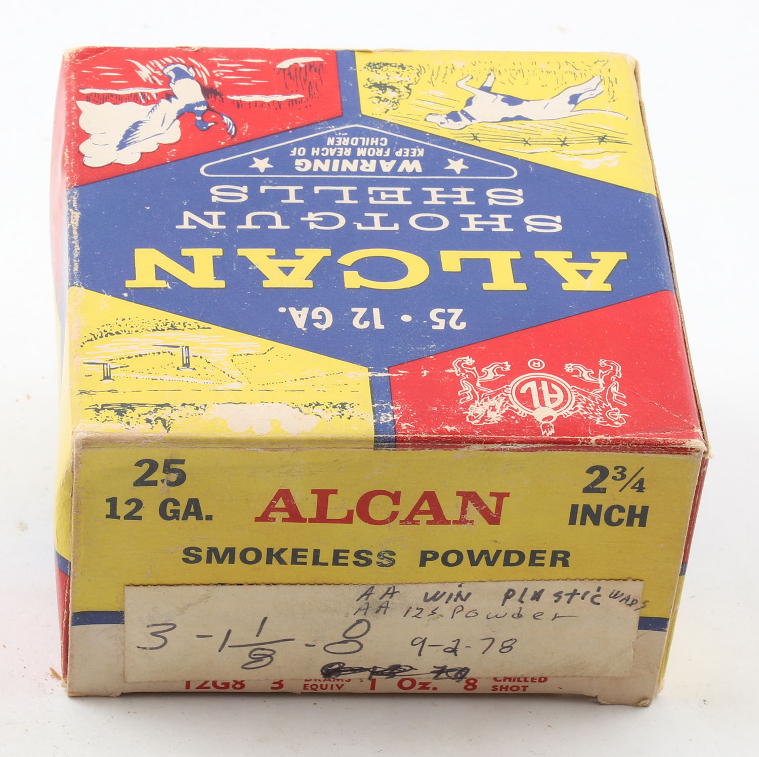 Alcan, Smokeless Powder, Ultramax, 12ga., 2 3/4'', 1pc., Full of mixed shots, shot size 8CH, multi-colored box, box is solid with great colors, plastic shells are excellent. Grade: Very Good - Value: 8 to 30