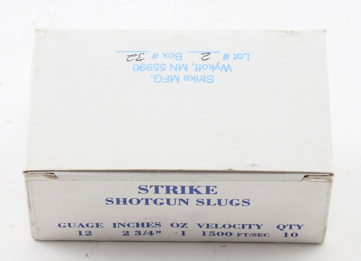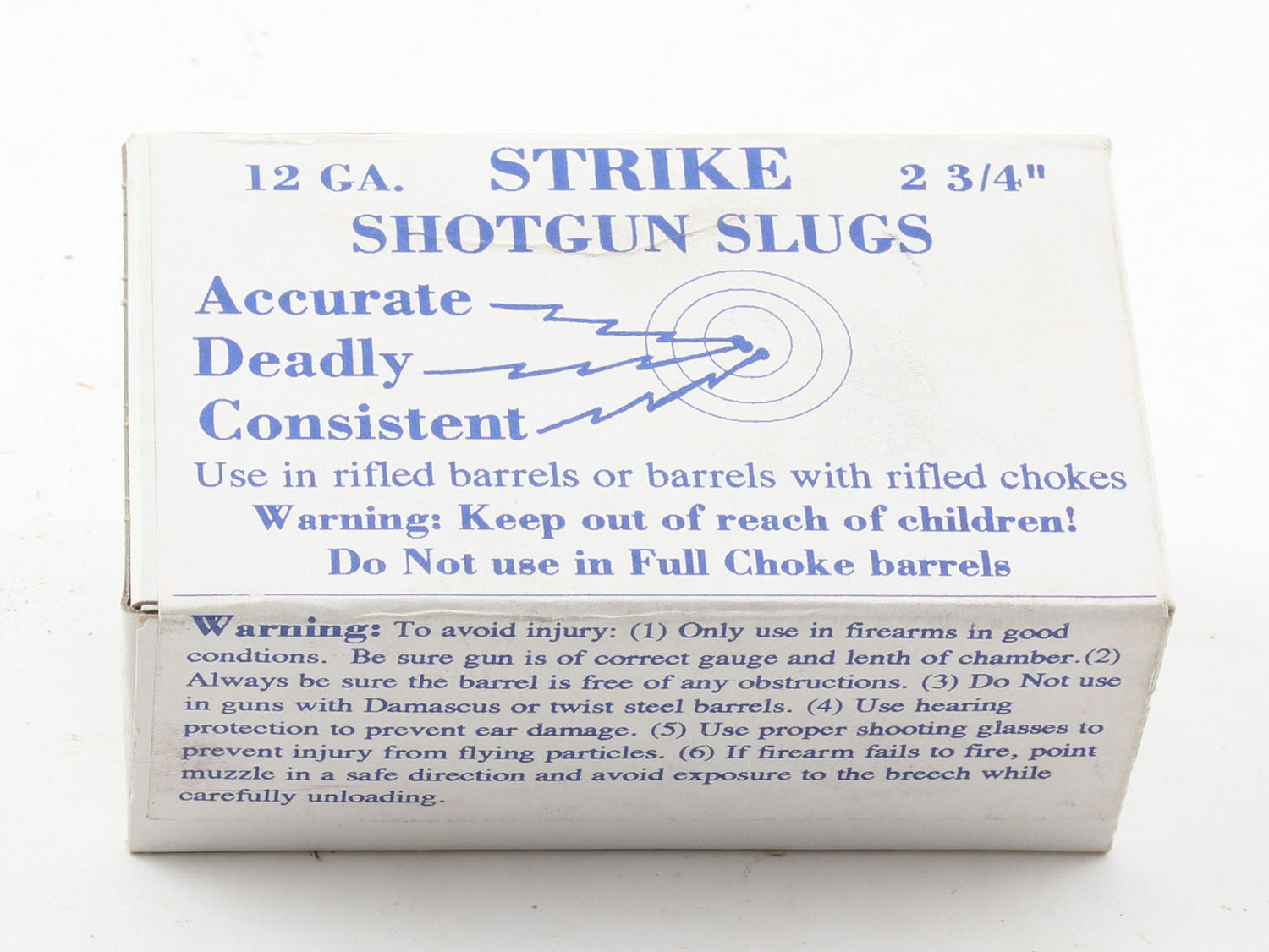 Strike Shotgun Slugs, 12ga., Full, 1pc., 2 3/4'', white box with white & blue print, box is very solid, plastic shells are excellent. Grade: Excellent ++ - Value: 10 to 30