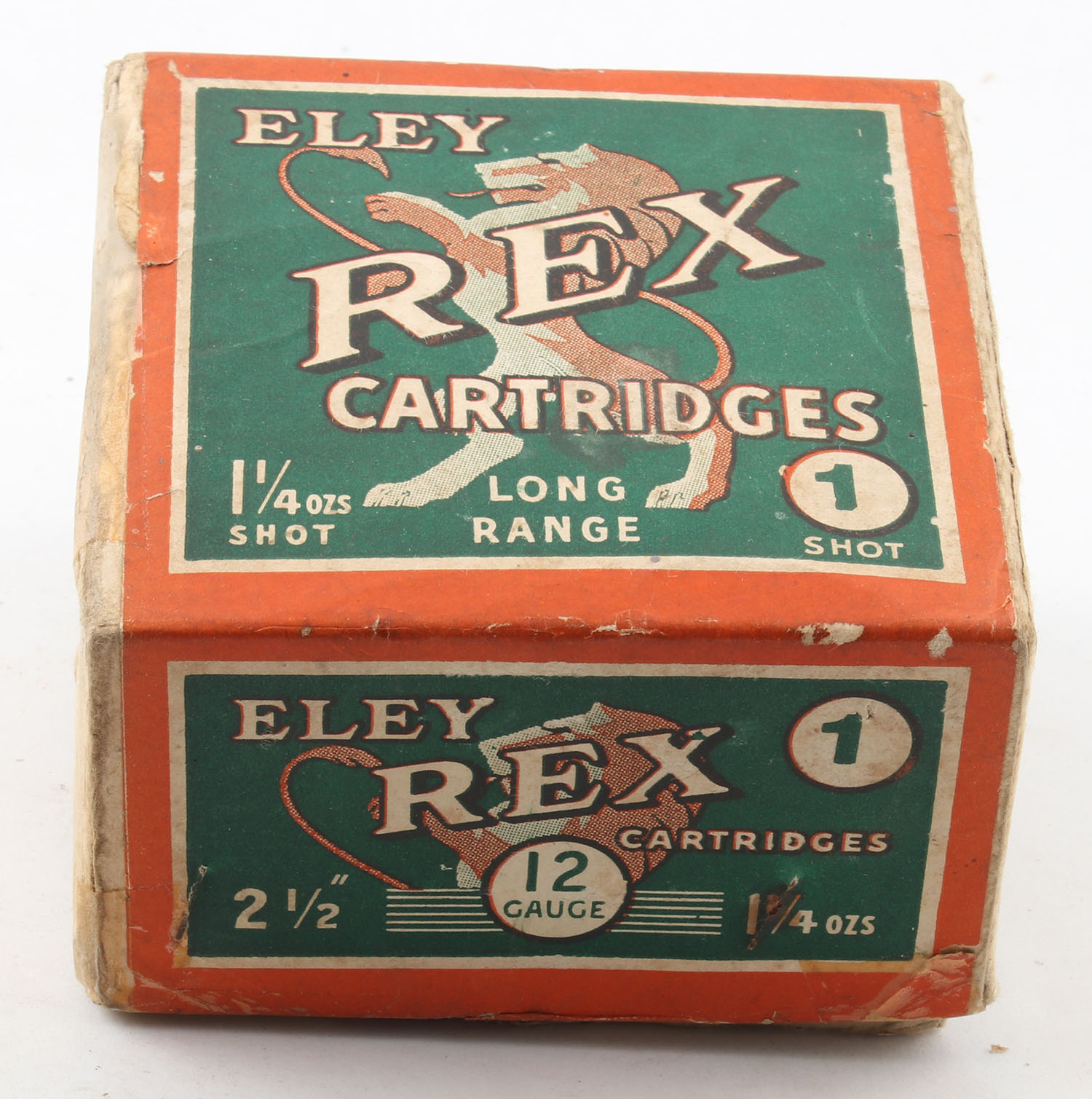 Eley, REX Cartridges, 12ga., 2pc., Empty, shot size 1, 2 1/2'', multi-colored box, box has age soiling & edge wear, box has tape repairs to seam splits, has writing on side of box, label is intact with great colors. Grade: Very Good - Value: 40 to 200