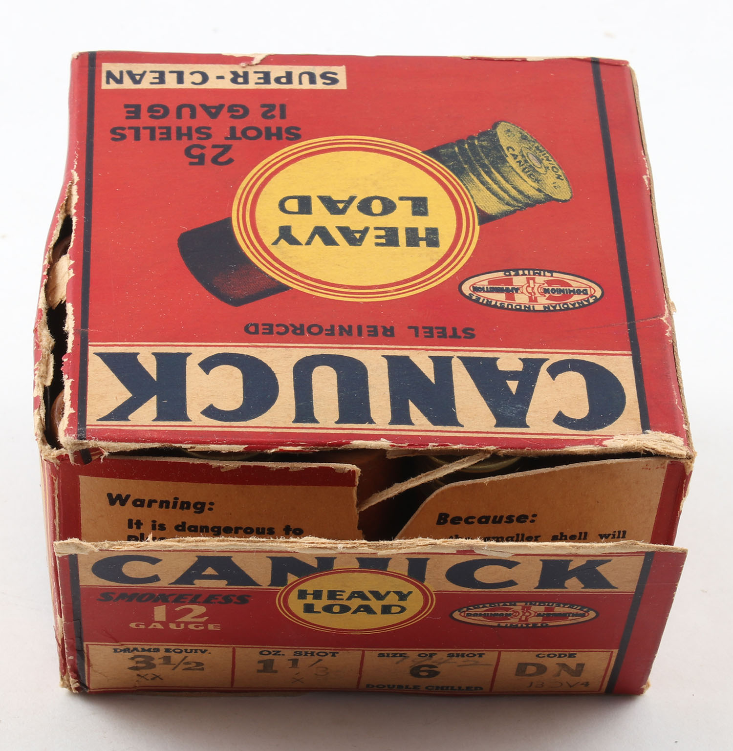 CIL, Canuck, 12ga., 1pc., Full with 24rds being correct shot, shot size 6Ch., multi-colored box, box has edge & corner wear, shell protrusion and a seam split to top lid, box has excellent colors, paper shells are excellent. Grade: Very Good + - Value: 20 to 60