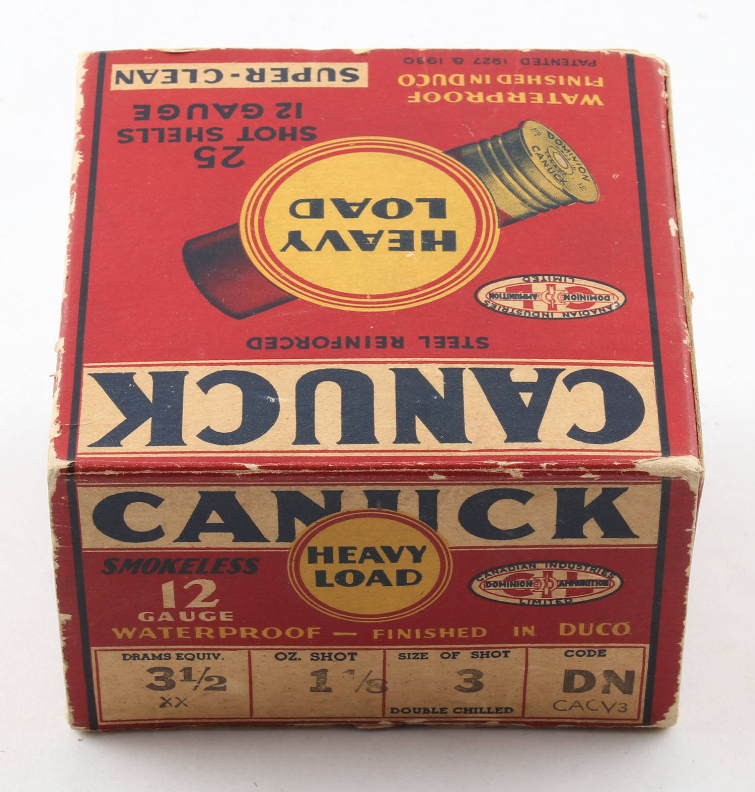 CIL, Canuck, Heavy Load, 12ga., 1pc., Empty, shot size 3CH., multi-colored box, box has edge & corner wear with excellent color. Grade: Excellent - Value: 10 to 50