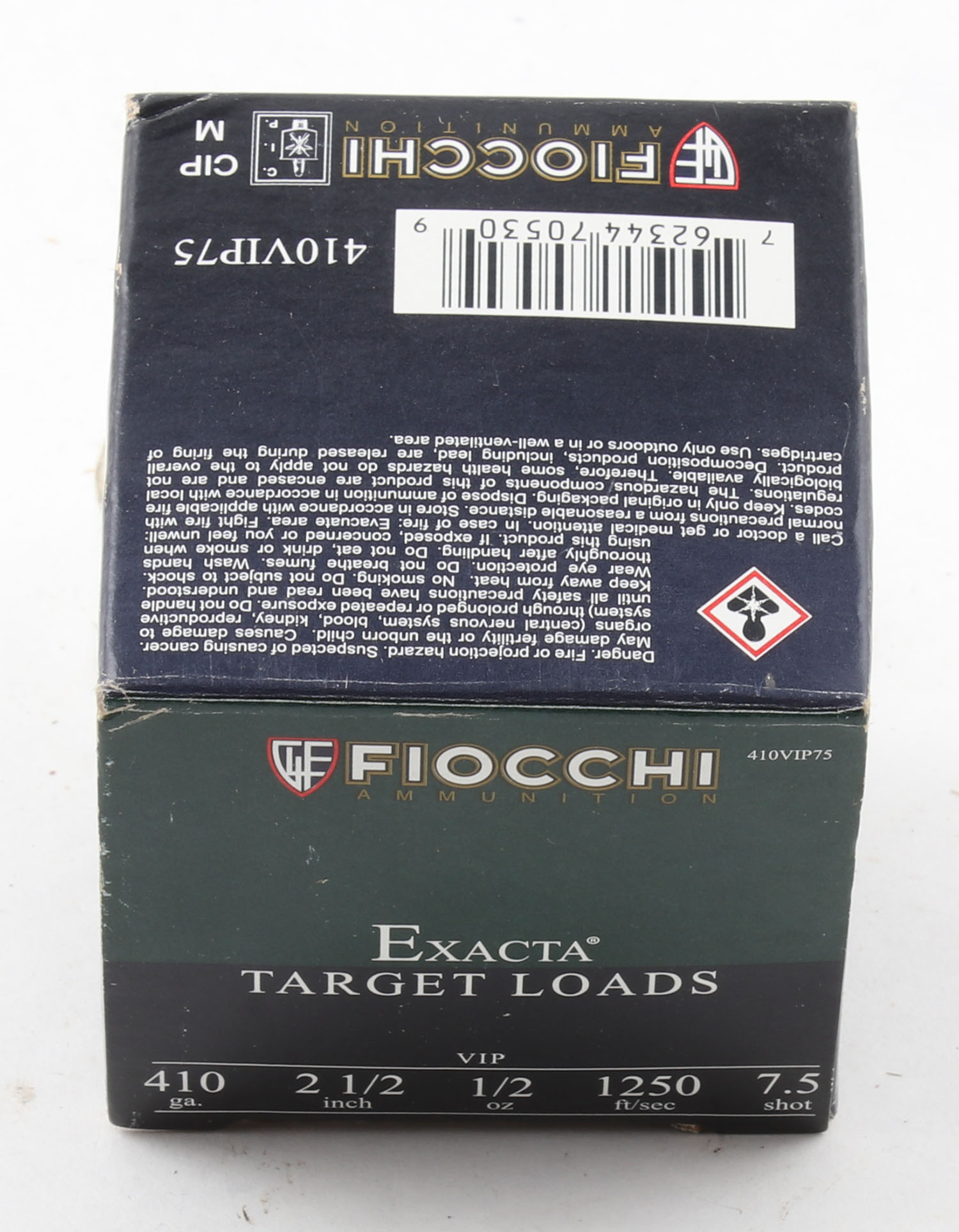 Fiocchi, Exacta Target Loads, 410ga., 1pc., Full, shot size 7 1/2, 2 1/2'', multi-colored box, box is very solid with excellent color, plastic shells are excellent. Grade: Excellent - Value: 10 to 50