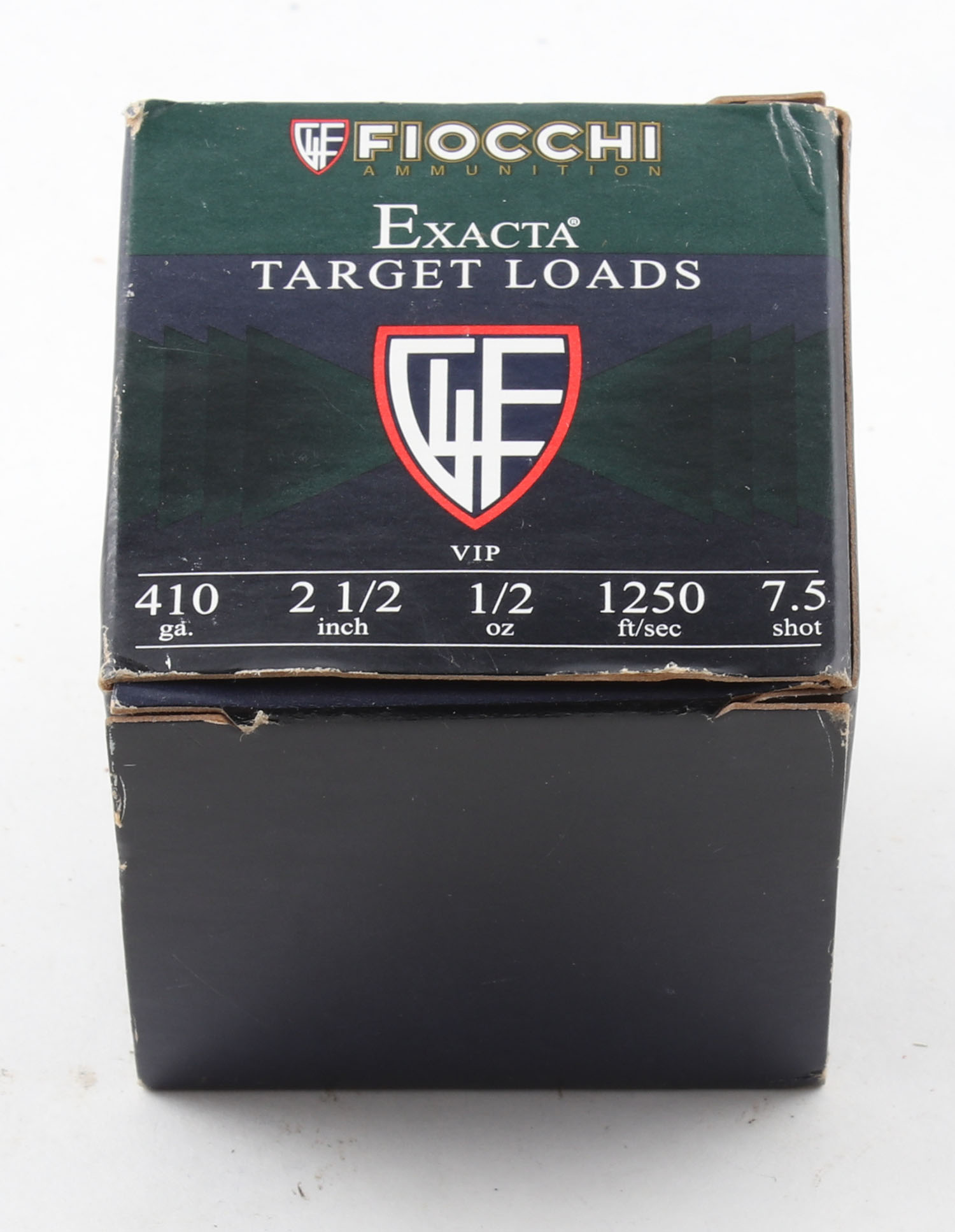 Fiocchi, Exacta Target Loads, 410ga., 1pc., Full, shot size 7 1/2, 2 1/2'', multi-colored box, box is very solid with excellent color, plastic shells are excellent. Grade: Excellent - Value: 10 to 50