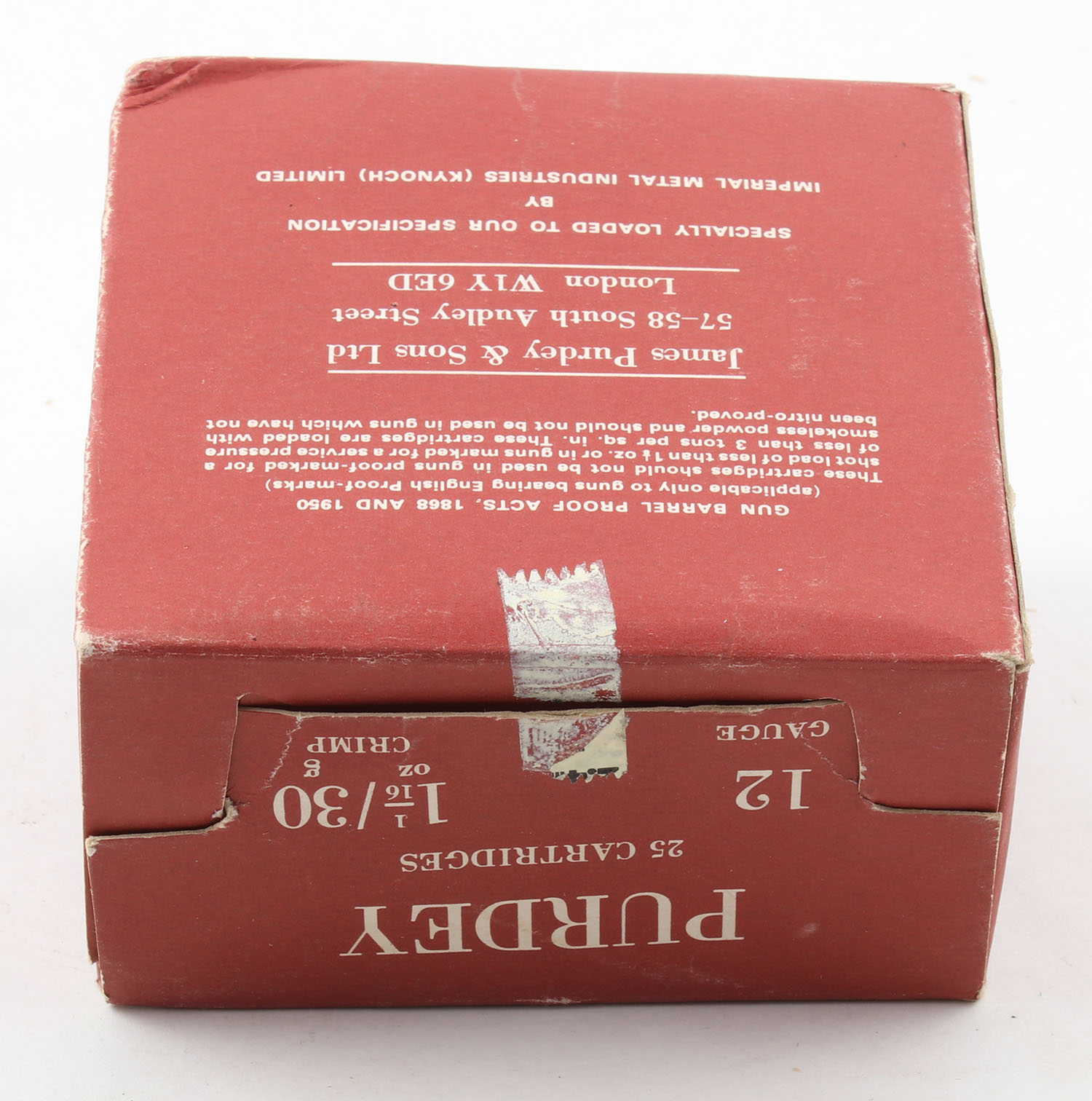 Eley, Purdey London, 12ga., 1pc., Full, shot size 7, red box with white print, box has light edge & corner wear with great color, paper shells are minty. Grade: Very Good ++ - Value: 10 to 50