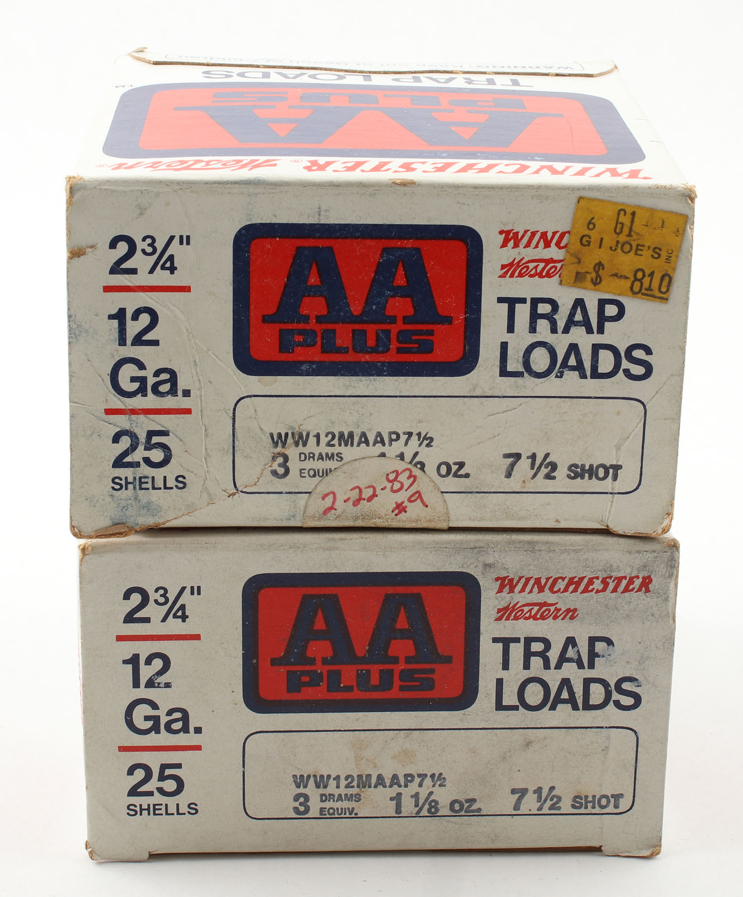 Lot of 2 Winchester, AA Plus Trap Loads, 12ga., 1pc., Appears Full, shot size 7 1/2, multi-colored boxes. Grade: Very Good - Value: 10 to 40