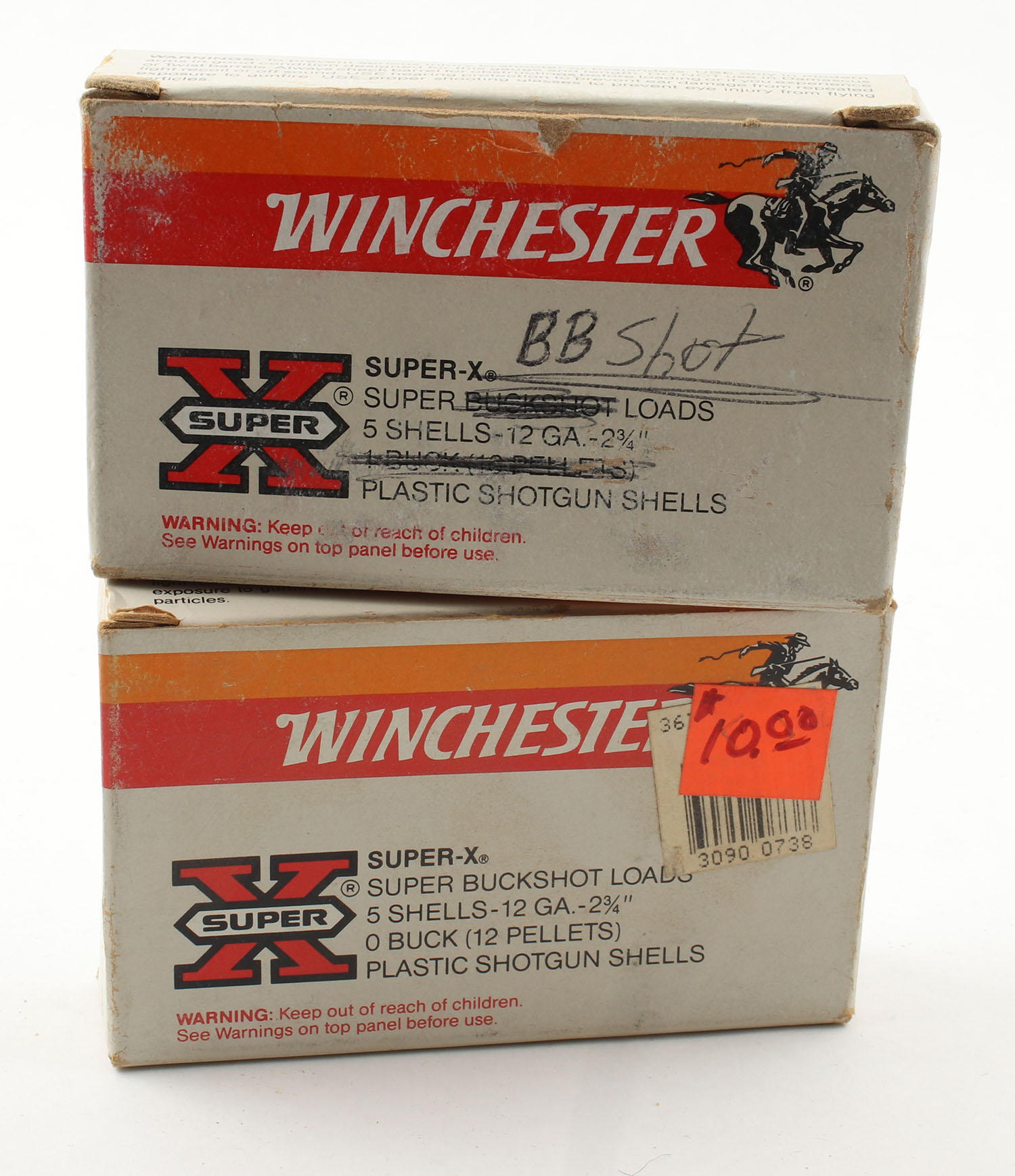 Lot of 2 Winchester, 12ga., 1pc., Appears Full, shot size 0 BUCK & 1 BUCK, multi-colored boxes. Grade: Very Good - Value: 8 to 20