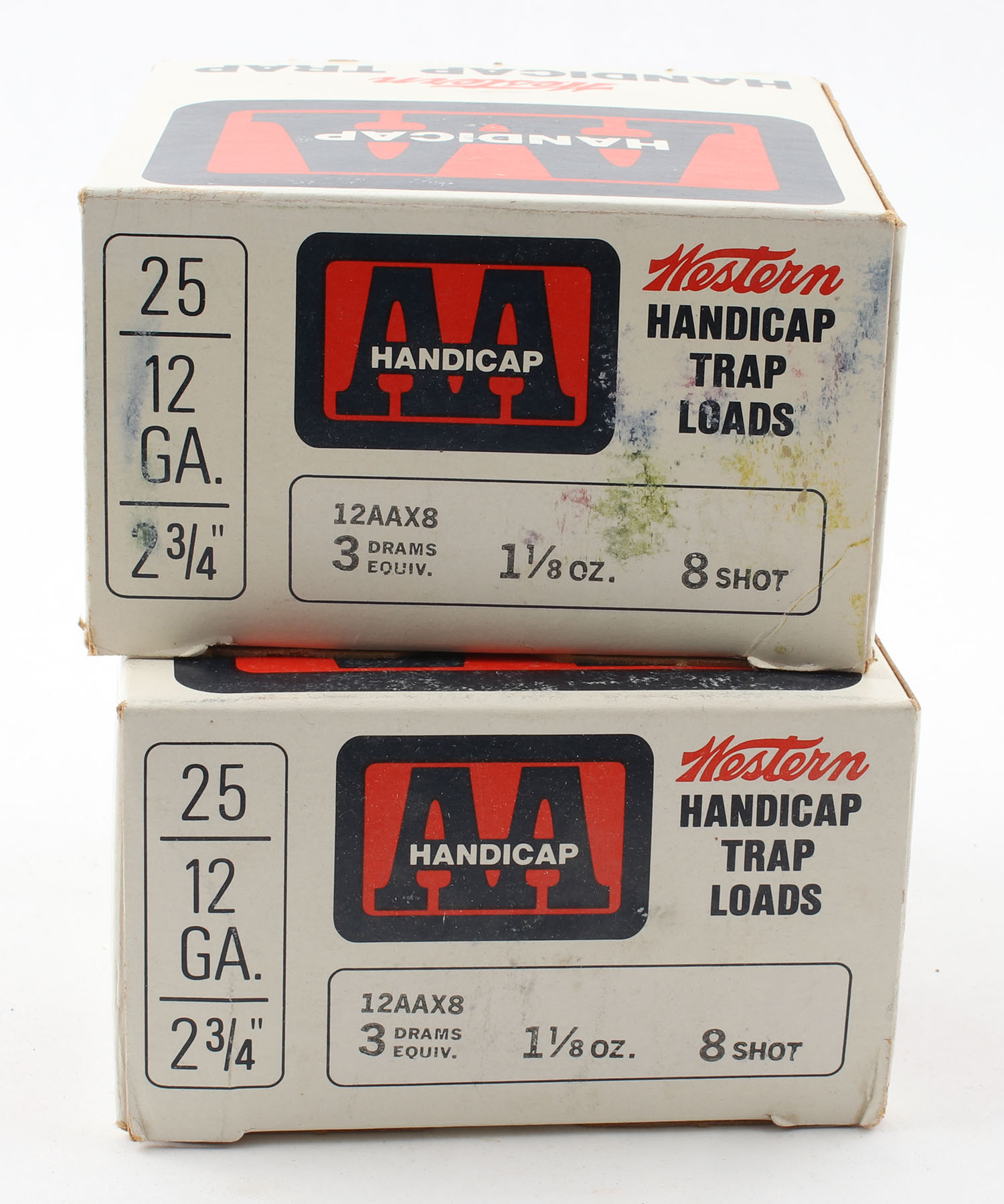 Lot of 2 Western, 12ga., 1pc., Appears Full, shot size 8, multi-colored box. Grade: Excellent - Value: 10 to 40