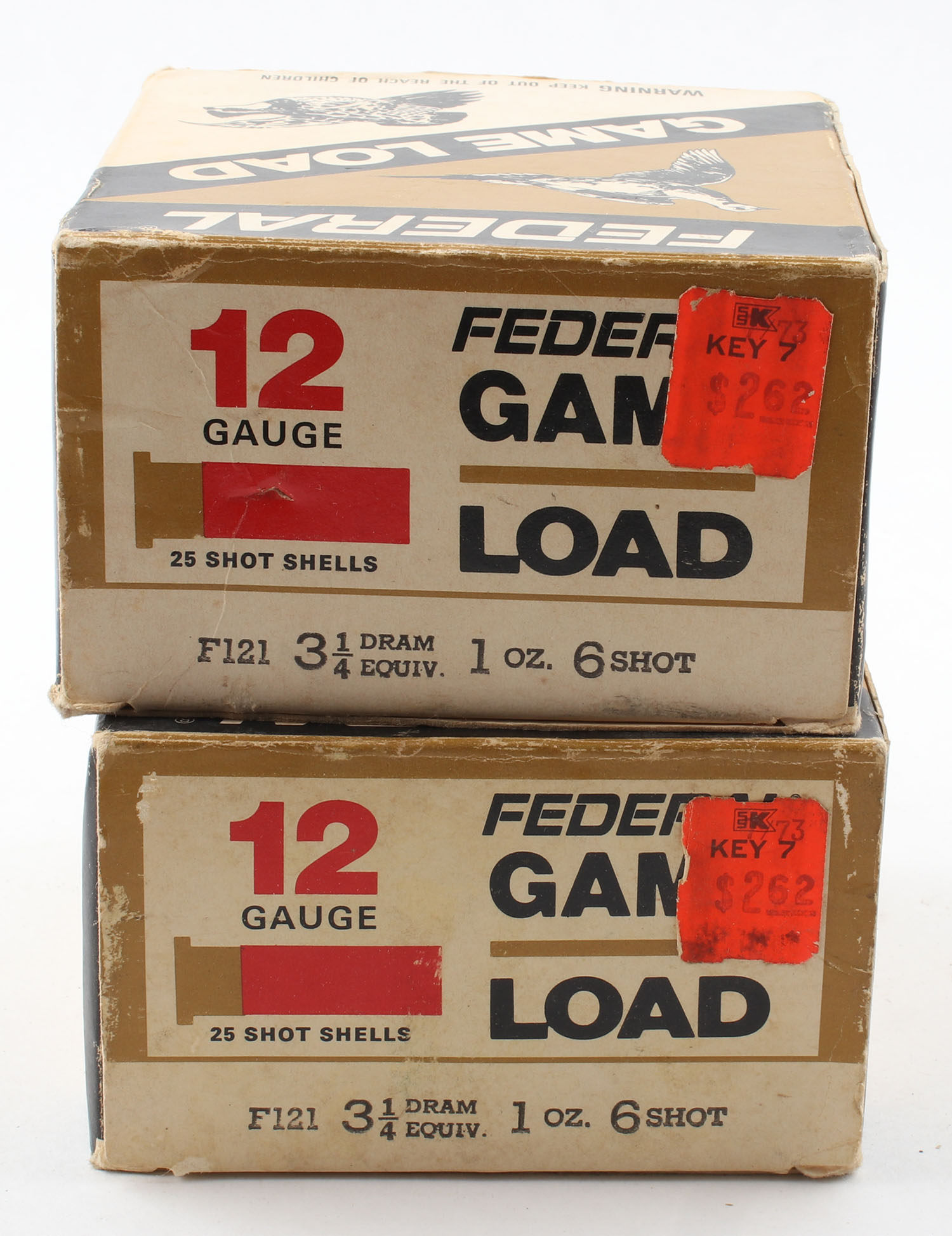 Lot of 2 Federal, 12ga., 1pc., Appears Full, shot size 6, multi-colored boxes. Grade: Very Good ++ - Value: 10 to 40