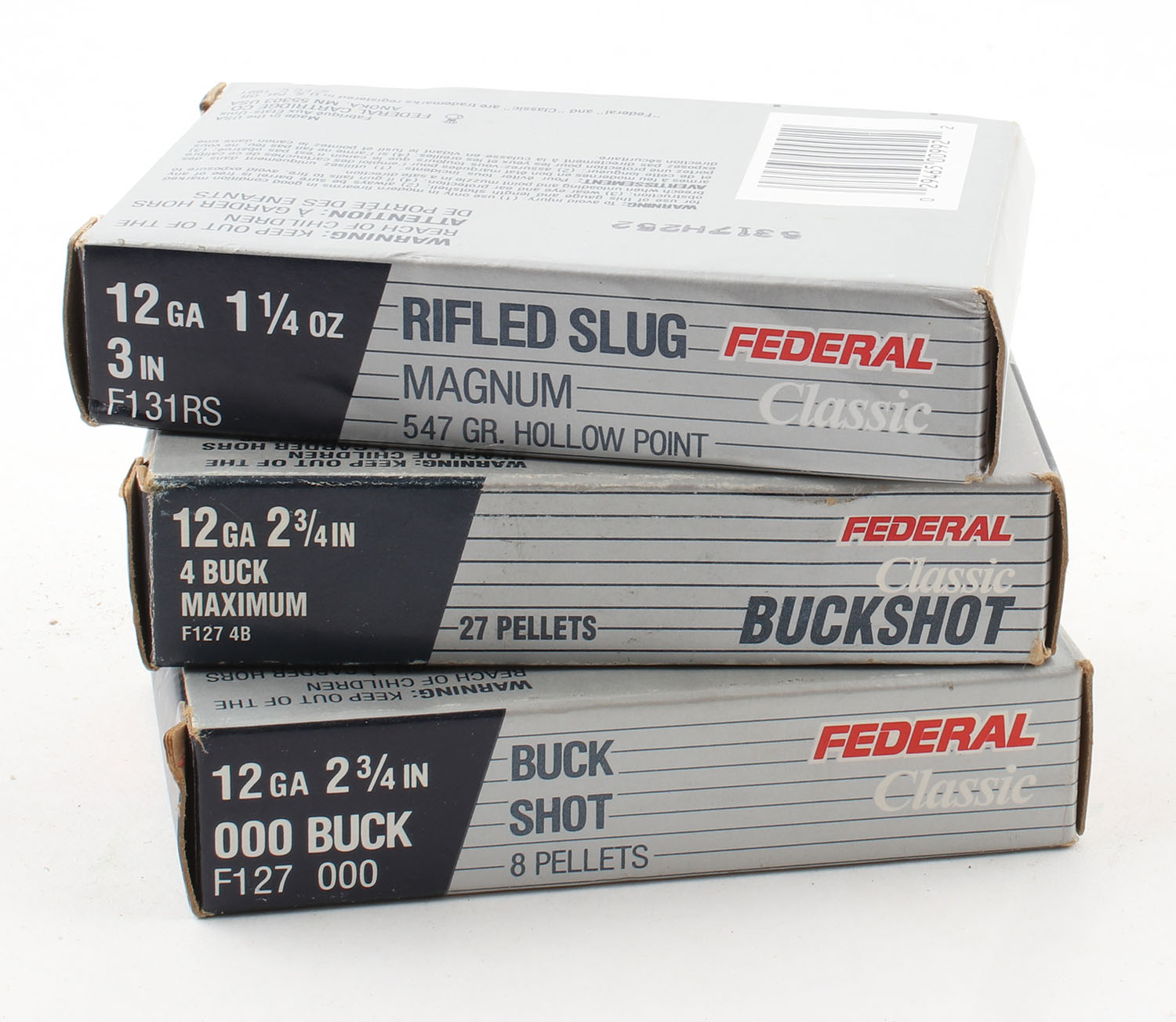 Lot of 3 Federal, 12ga., 1pc., Appears Full, shot size 000BUCK/ 4 BUCK/ Rifled Slug, multi-colored boxes. Grade: Excellent - Value: 10 to 30