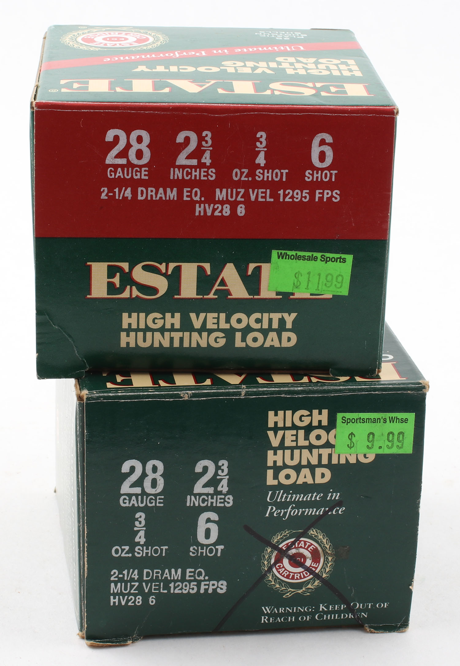 Lot of 2 Estate, 28ga., 1pc., Appears Full, shot size 6, multi-colored box. Grade: Excellent - Value: 10 to 40